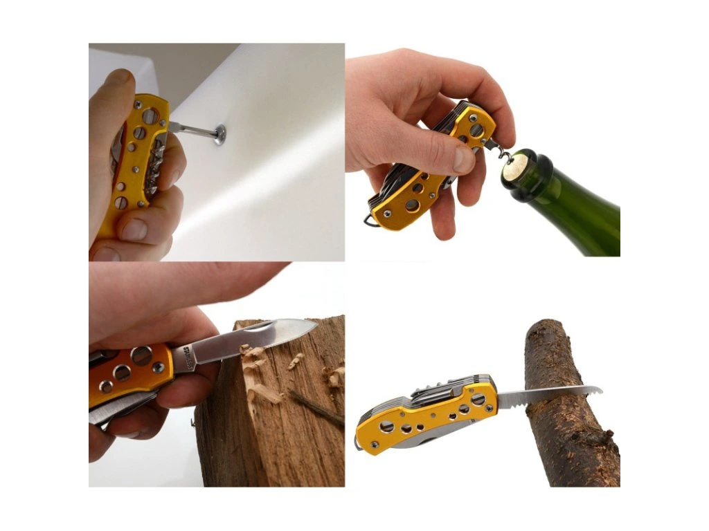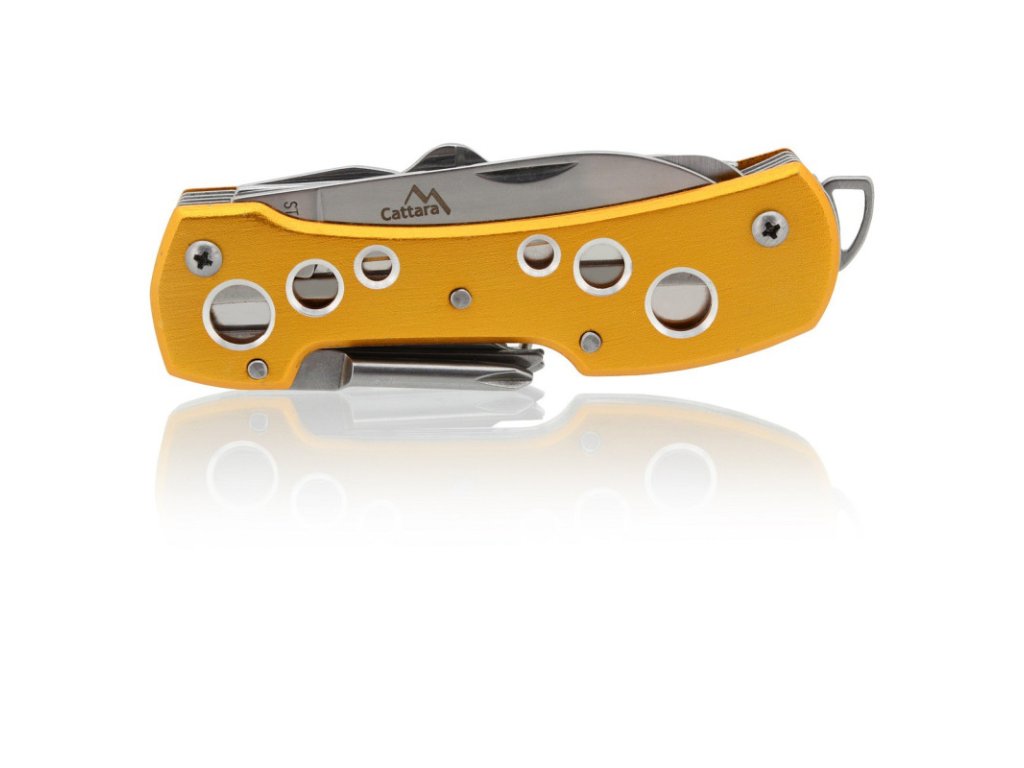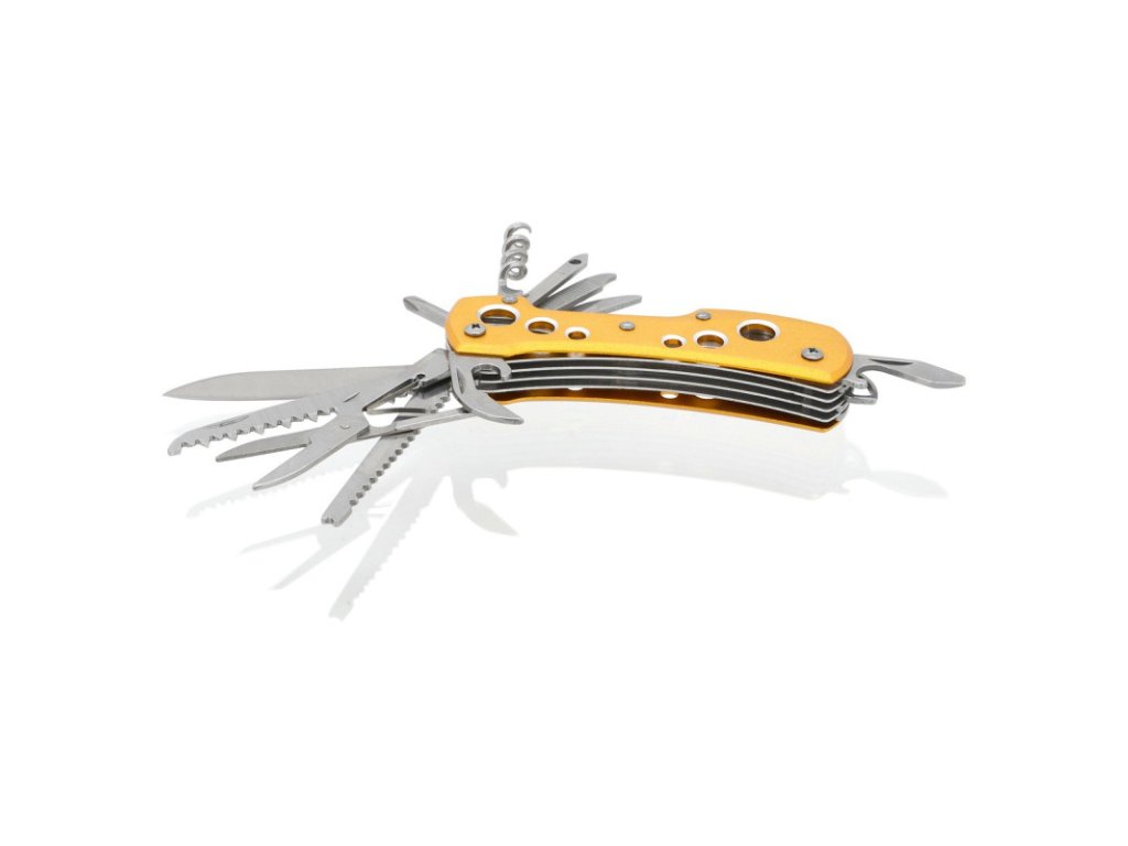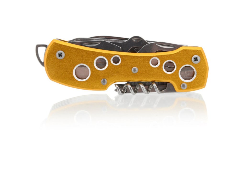 Rukojeť je kvalitně zpracována z aluminia, barveného žlutou až zlatavou barvou s perforací vrchní i spodní strany. Nožík díky svým funkcím, najde uplatnění opravdu všude a je dobré ho mít při ruce kdykoliv a kdekoliv.