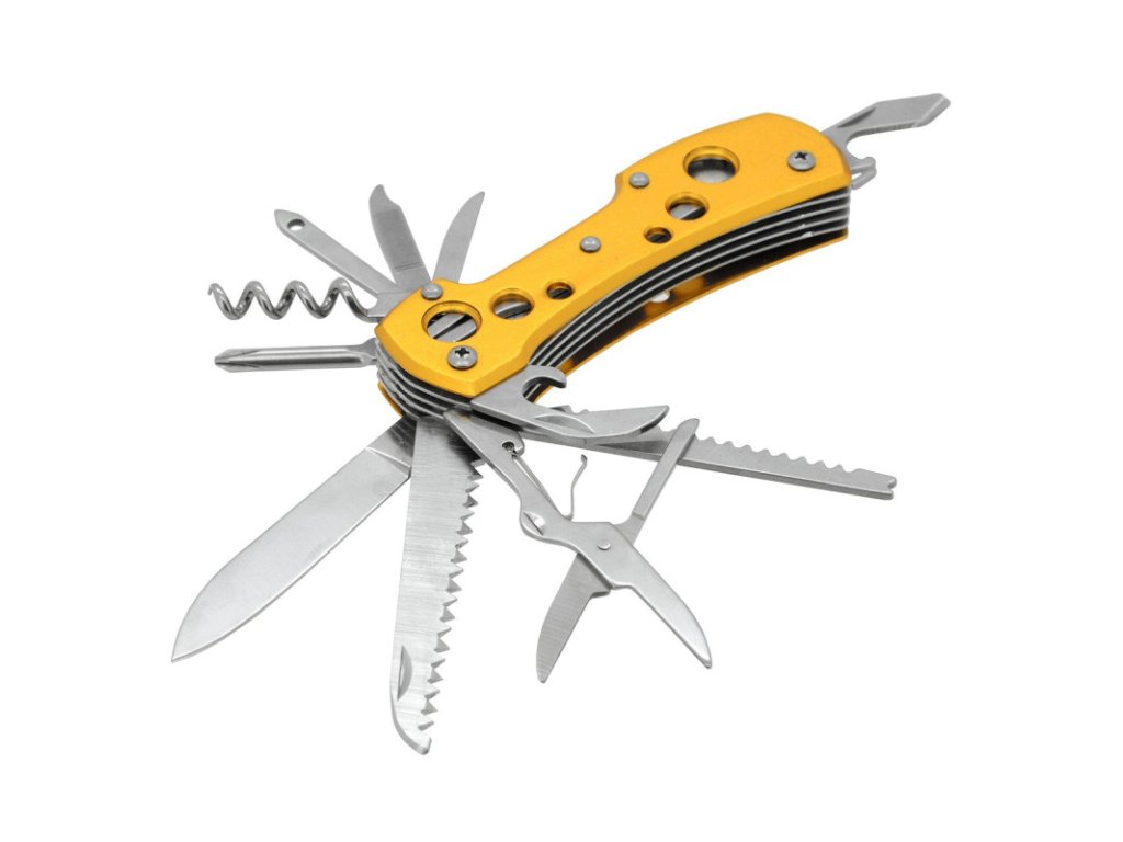 Na vnitřní straně, tedy vespod rukojeti, se skrývají otvírák na plechovky, nůžtičky, škrabák na rybí šupiny, pilka na dřevo a samotný nůž délky 6 cm. Na druhé, vnější straně rukojeti se ukrývají křížový šroubovák nejběžnějších rozměrů, šídlo, pilníček, oko na hrubé šití a vývrtka na korkové špunty. Na zadní straně je rukojeť opatřena očkem pro přichycení např. na klíče a v neposlední řadě otvírákem na zátky, který může být použit i jako plochý šroubovák.