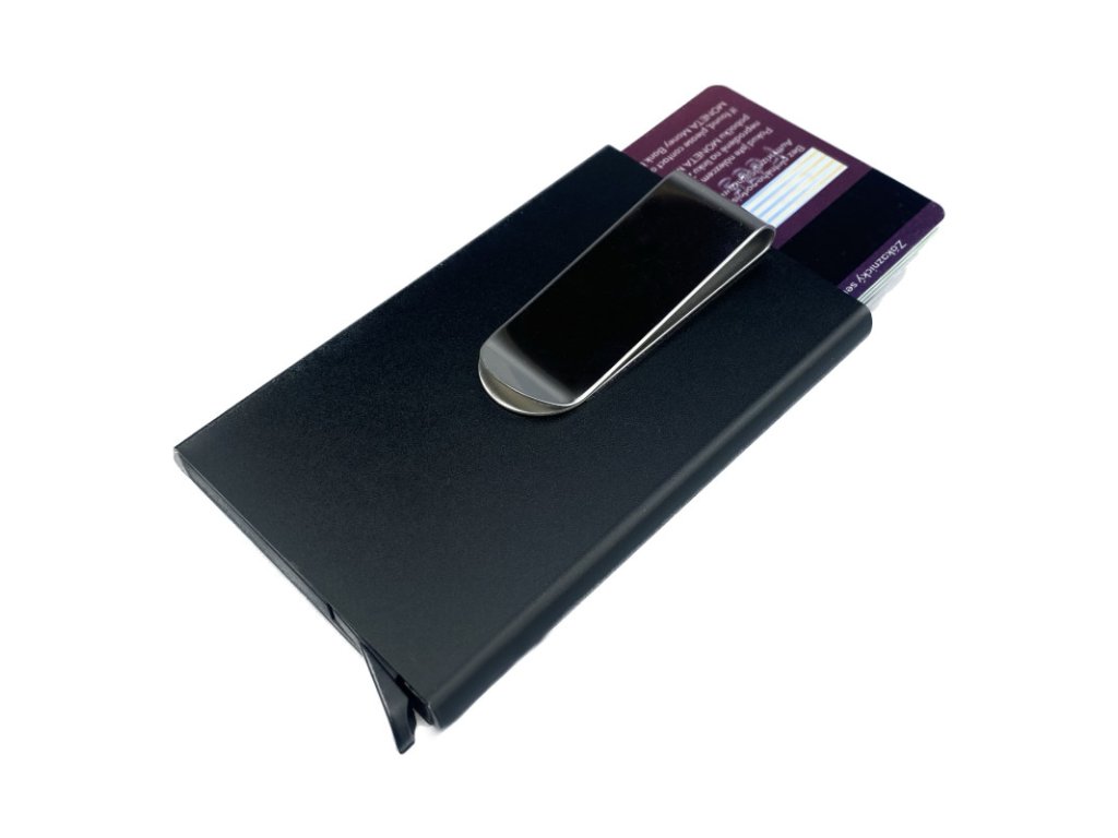 Bezpečnostní RFID kovové pouzdro a peněženka na karty a doklady až pro 8 karet se sponou na peníze - Černá
