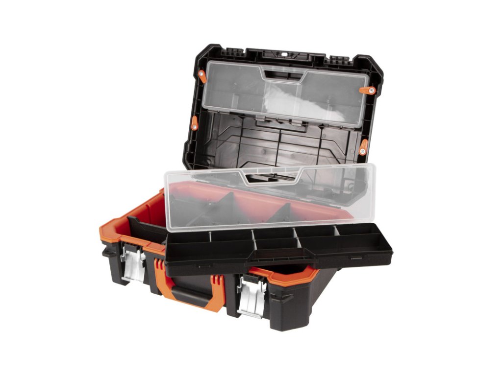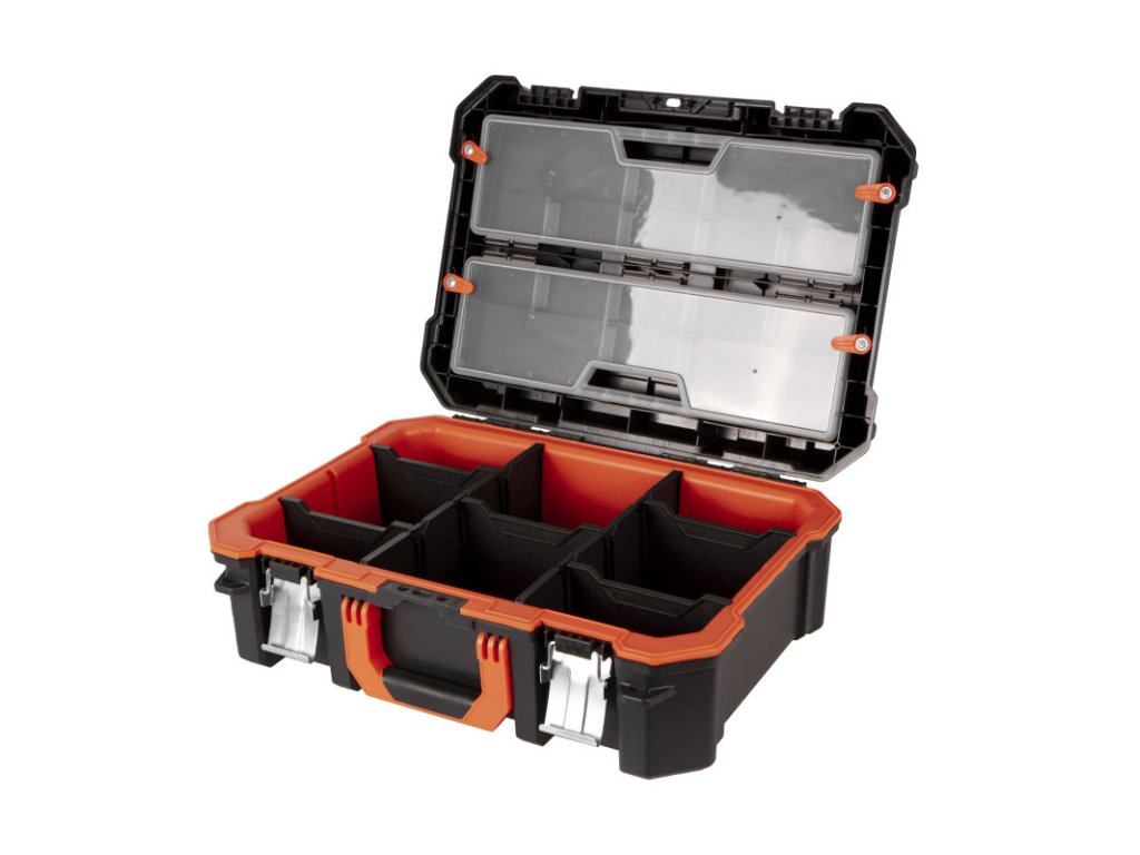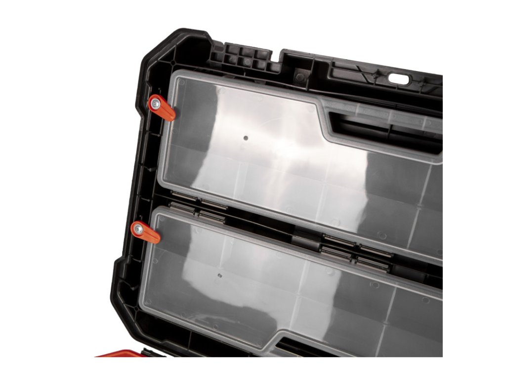 Díky vyjímatelným děličům si spodní velký prostor můžete přizpůsobit dle libosti a mít tak ve svém nářadí a drobném materiálu perfektní přehled.