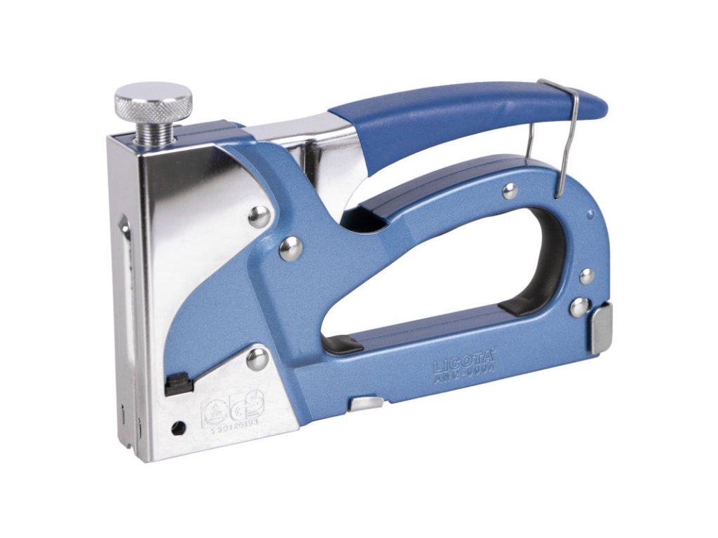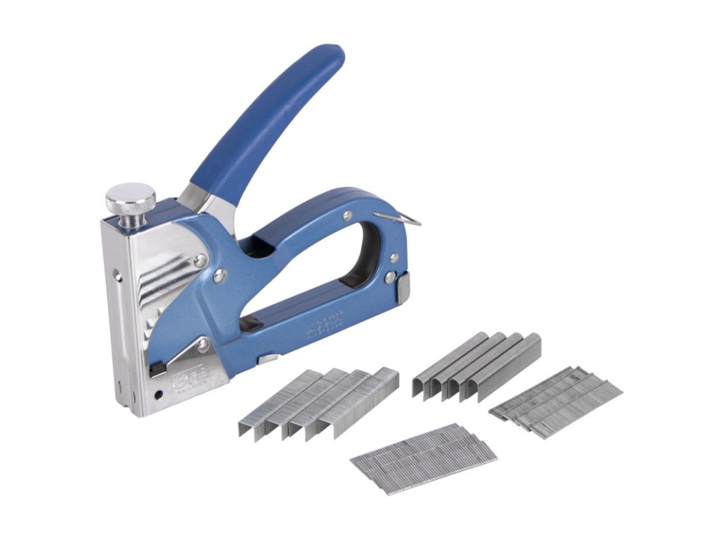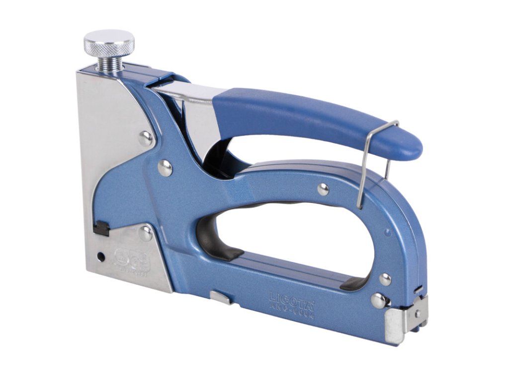 Komfortní čalounická sešívačka pro denní užití. Díky ergonomické rukojeti perfektně sedne do ruky. K dostání v příjemném, matně modrém odstínu (viz. ilustrační foto).