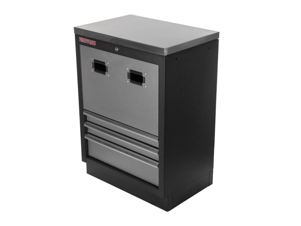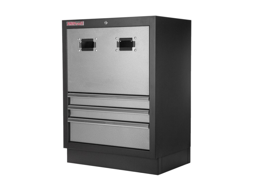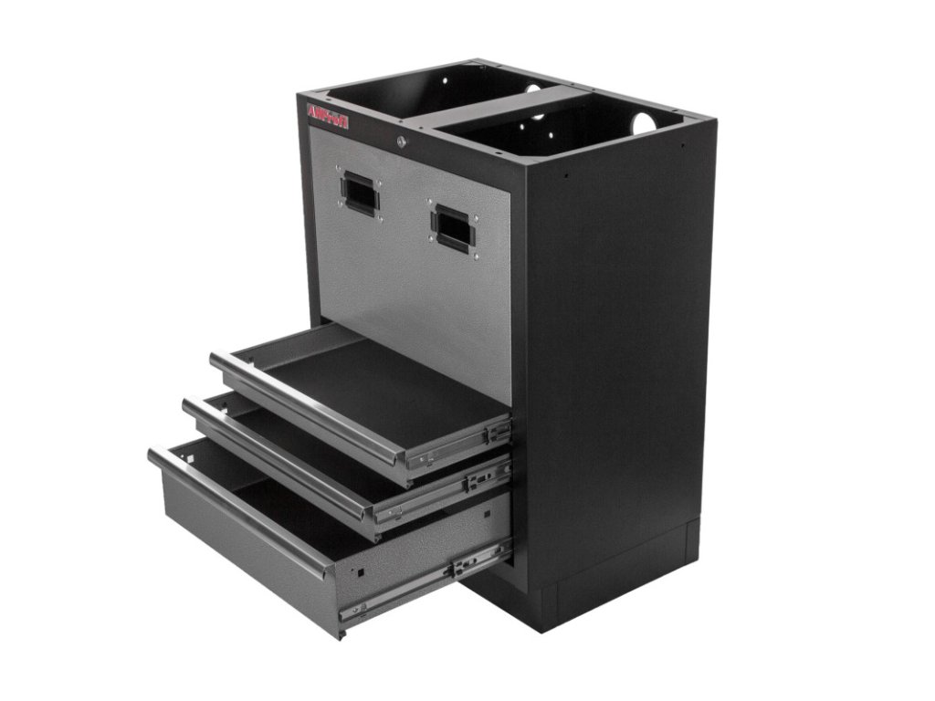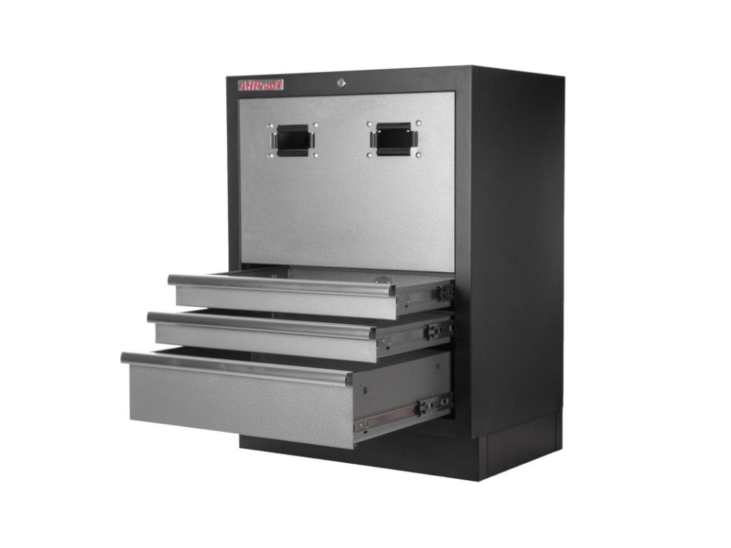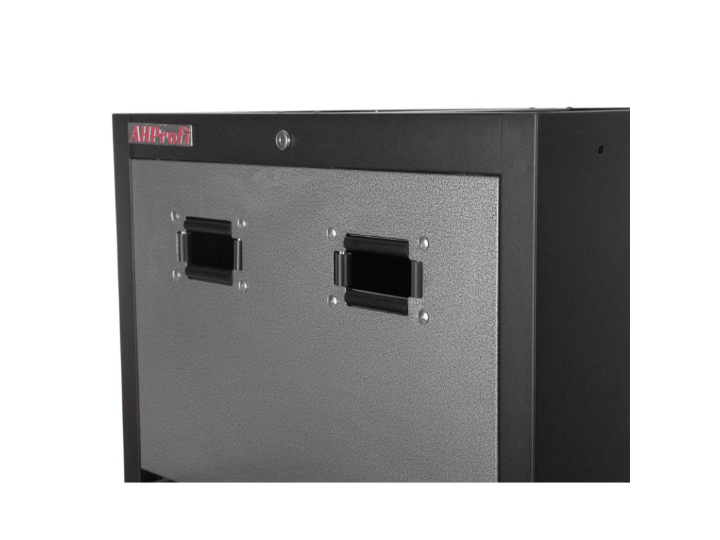 Celokovová PROFI dílenská dvoukřídlá skříňka s otvory pro uskladnění samonavíjecích bubnů na vzduch (XBA02) nebo elektřinu (12 m, 20 m).