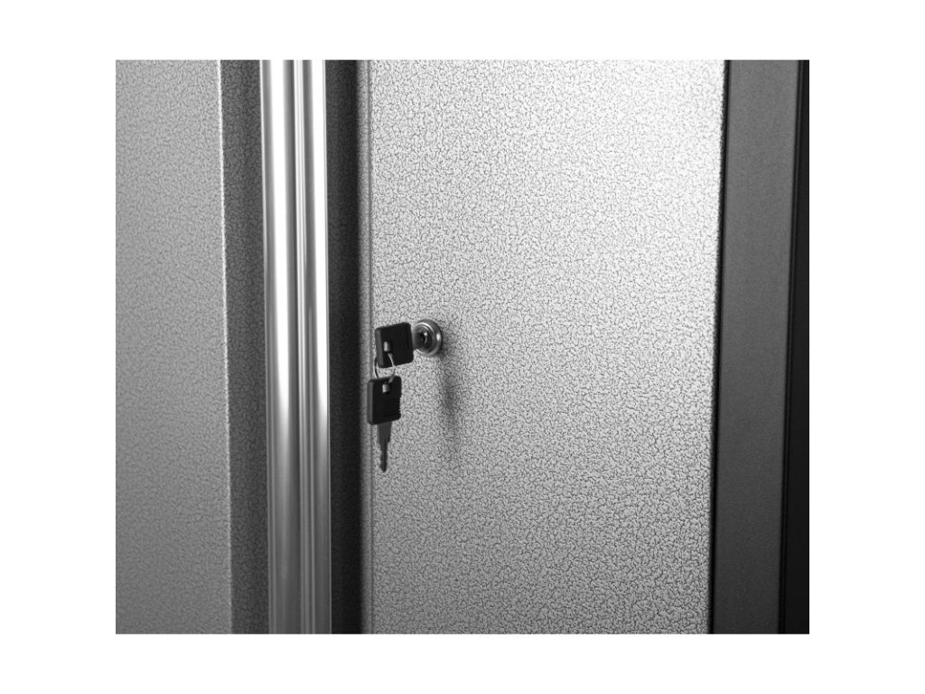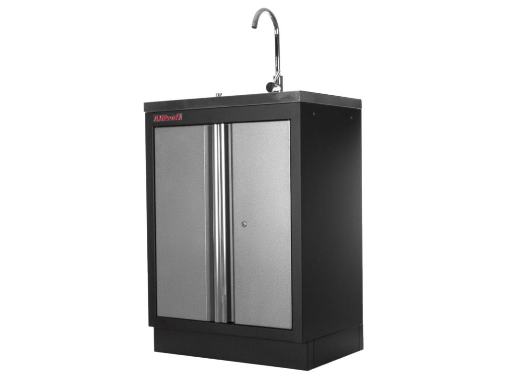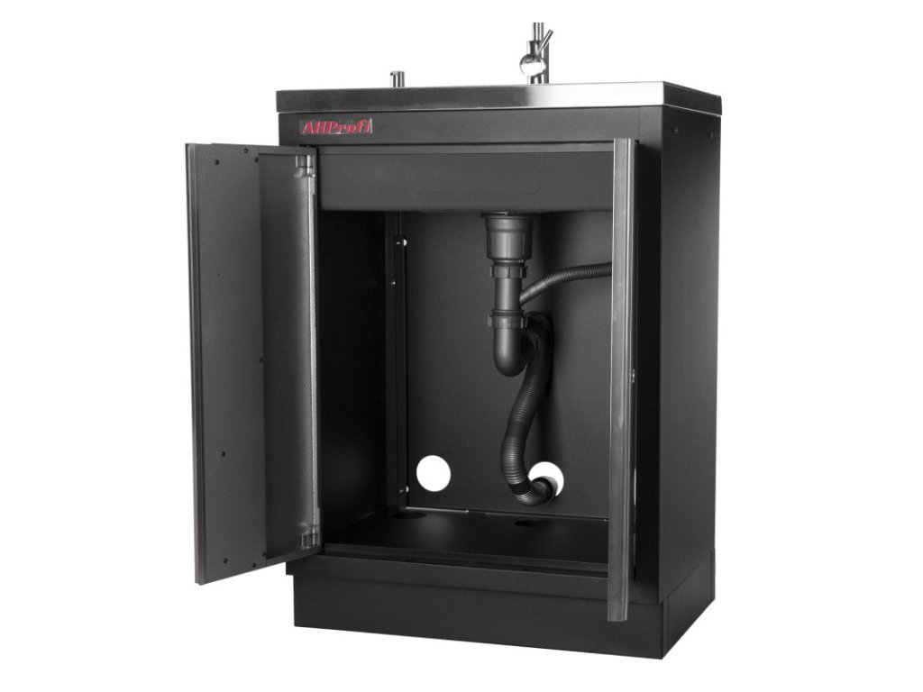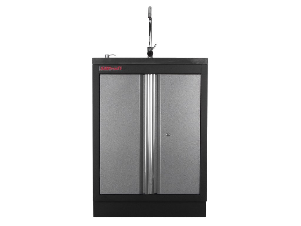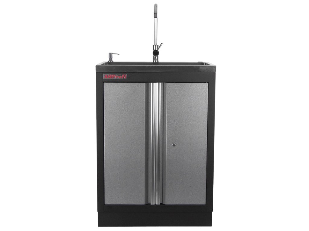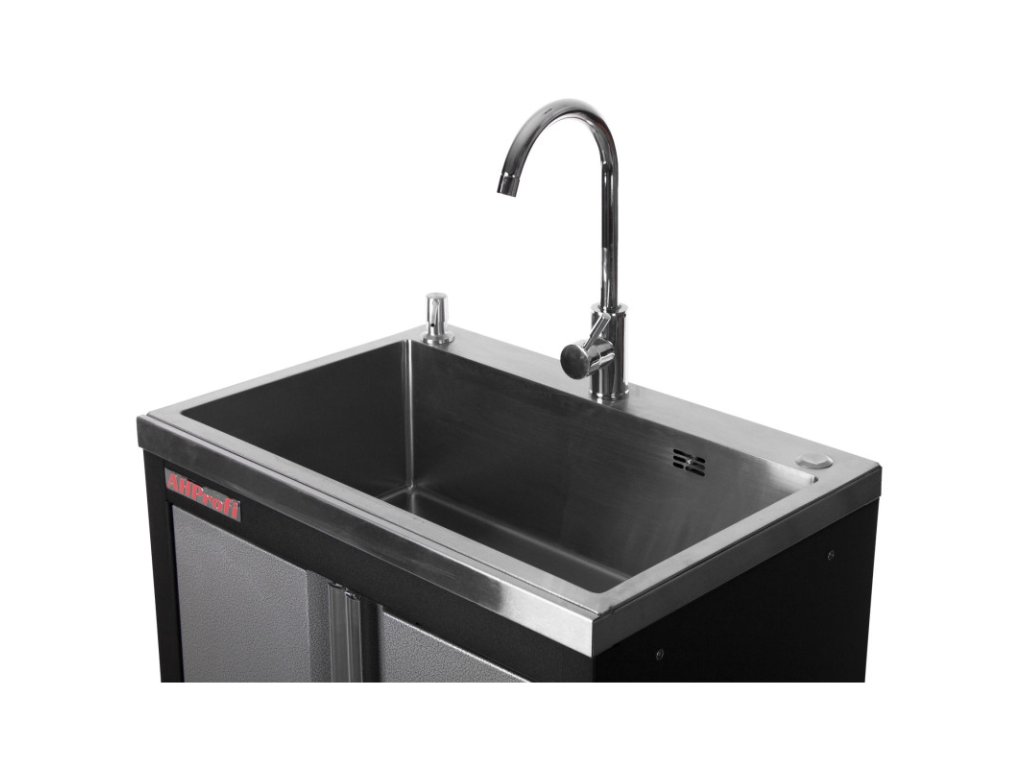 Celokovová PROFI dílenská dvoukřídlá skříňka s vestavěným nerezovým dřezem a baterií.