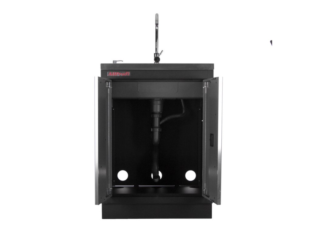 Kompletně vybavená skříňka s baterií, kterou lze umístit do jednoho z rohů nebo doprostřed nerezového dřezu.