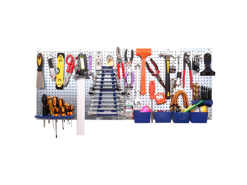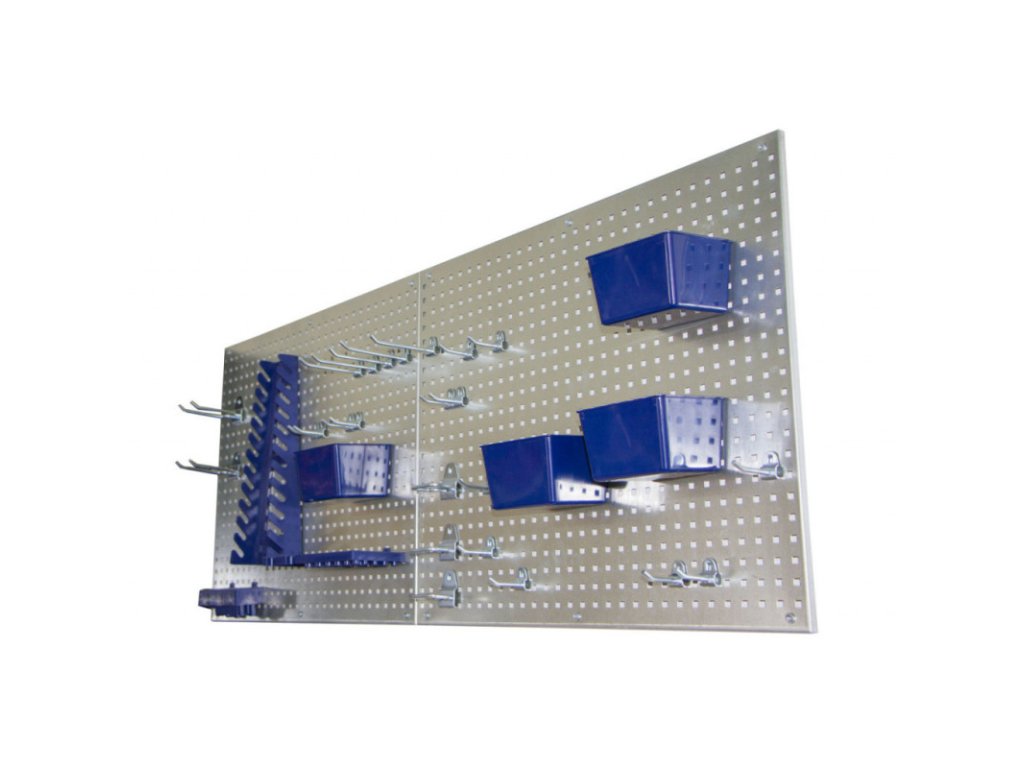 Příslušenství k deskám obsahuje: 15 krátkých háčků, 5 dlouhých háčků, 2 dvojité háčky, 3 držáky kleští, 4 plastové zásobníky, 1 držák klíčů, 1 držák šroubováků a 1 držák vrtáků.