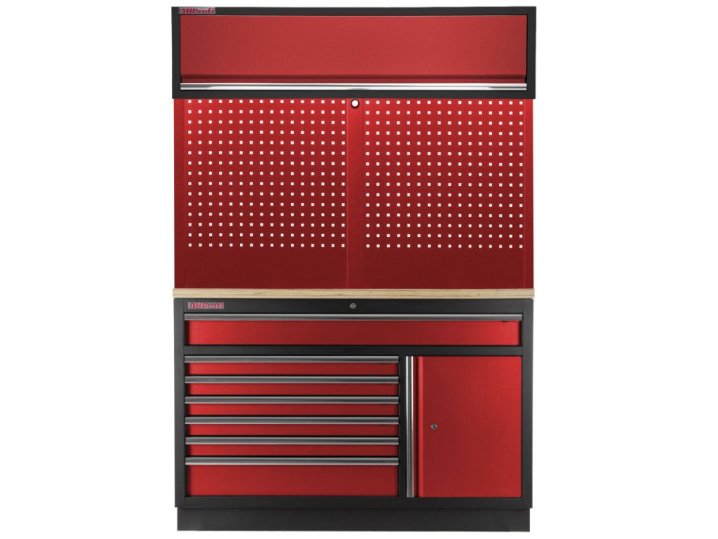 Spodní široká celokovová dílenská skříňka se 7 zásuvkami, skříňkou a dřevěnou pracovní deskou.