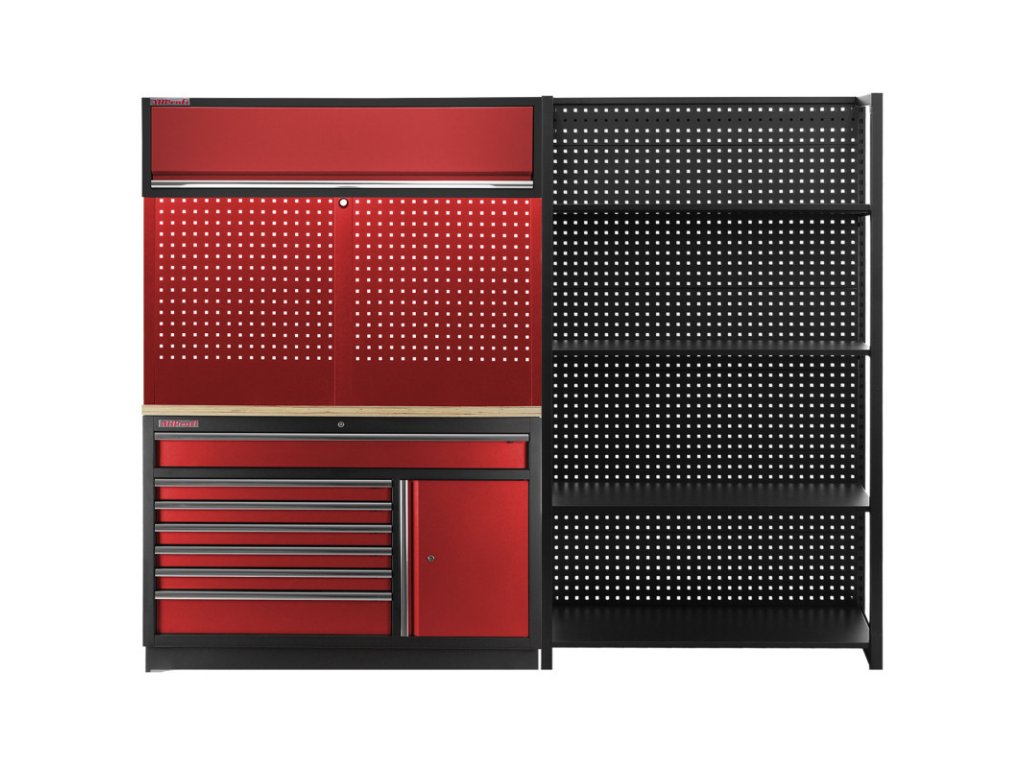 Sestava PROFI RED dílenského nábytku s jedním širokým regálem je vhodnou alternativou do menších prostor.