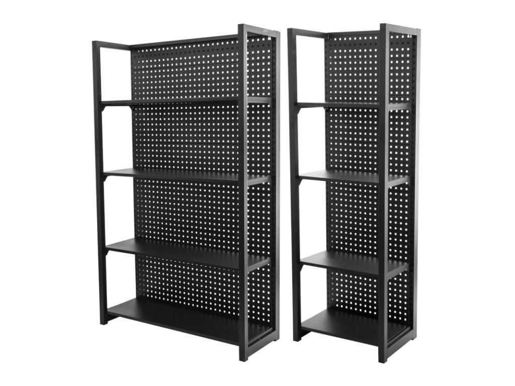 Stabilitu regálů zajišťují bočnice a zadní děrovaná deska, kterou lze také využít pro zavěšení drobného nářadí pomocí háčků (nářadí a háčky nejsou součástí balení).