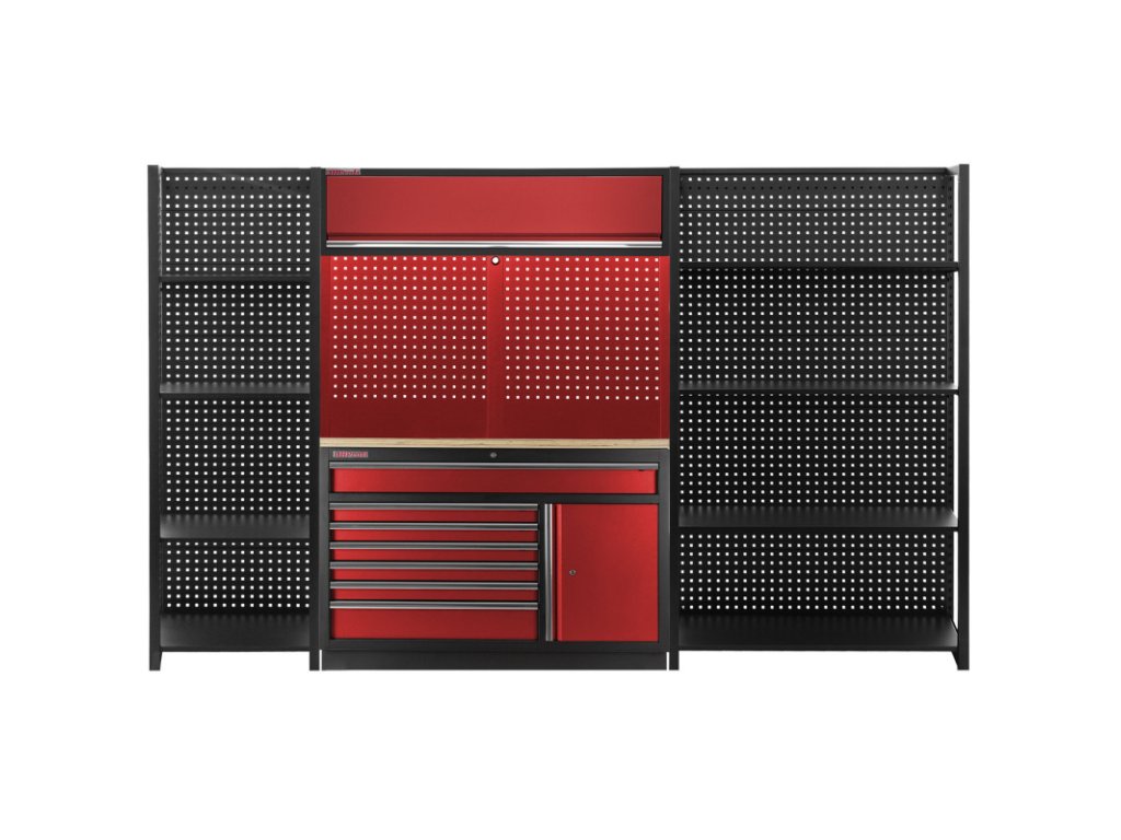 Sestava PROFI RED dílenského nábytku s jedním úzkým a jedním širokým regálem je vhodnou alternativou do menších prostor.