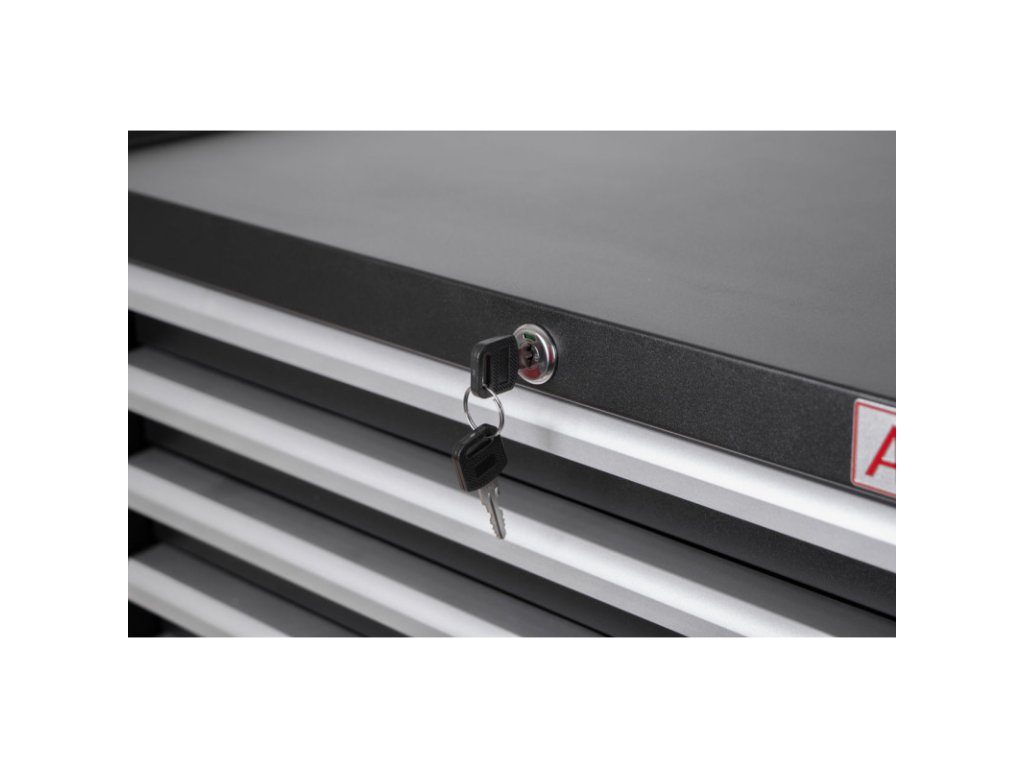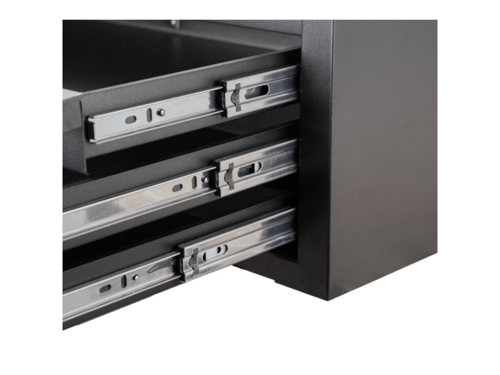 - 5 uzamykatelných zásuvek na vodicích lištách s kuličkovými pojezdy.
