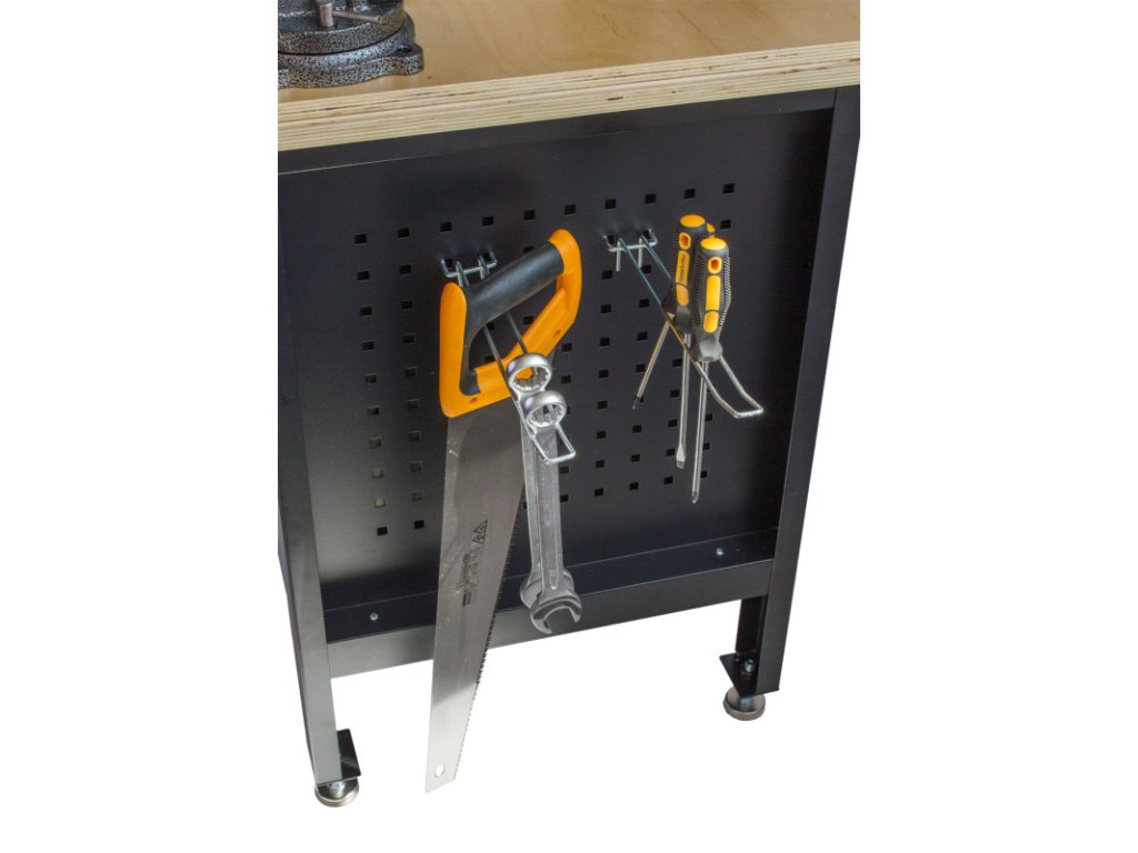 Na obou bocích je pracovní stůl vybaven děrovanou deskou.