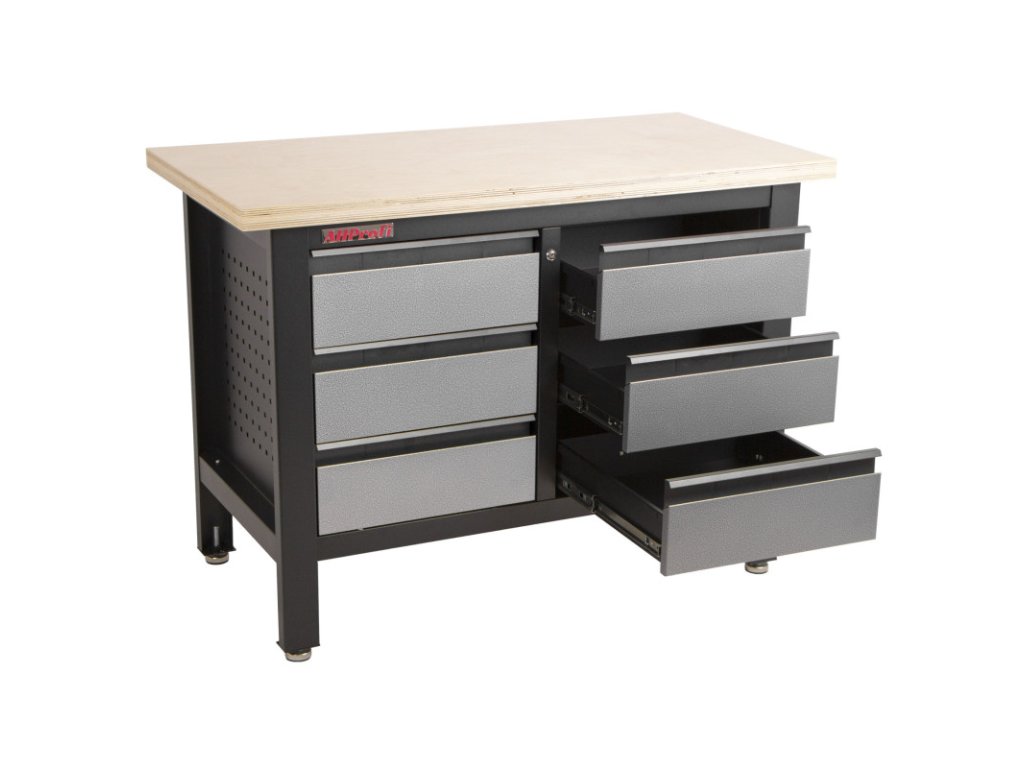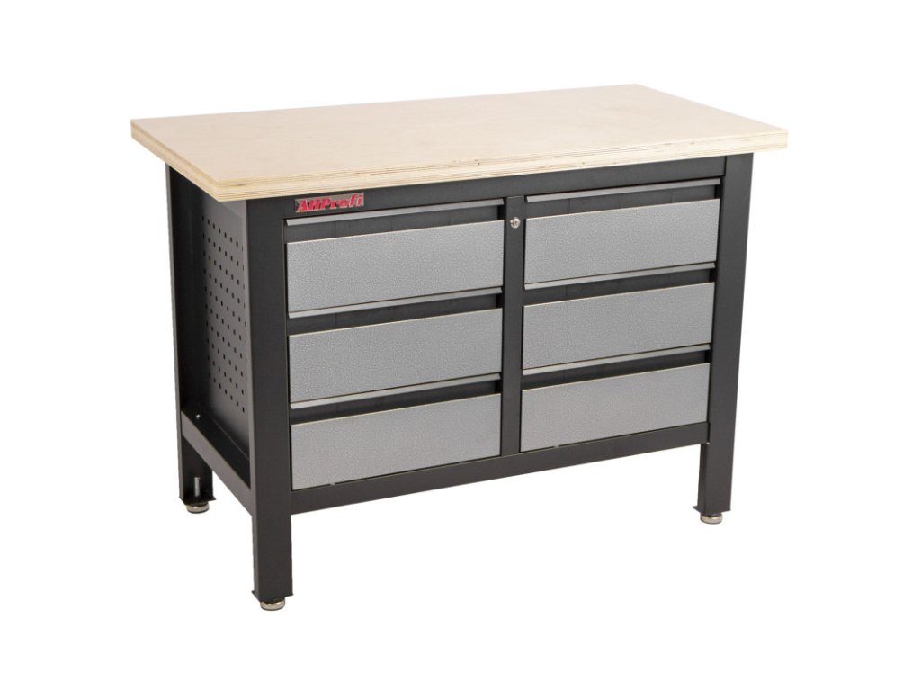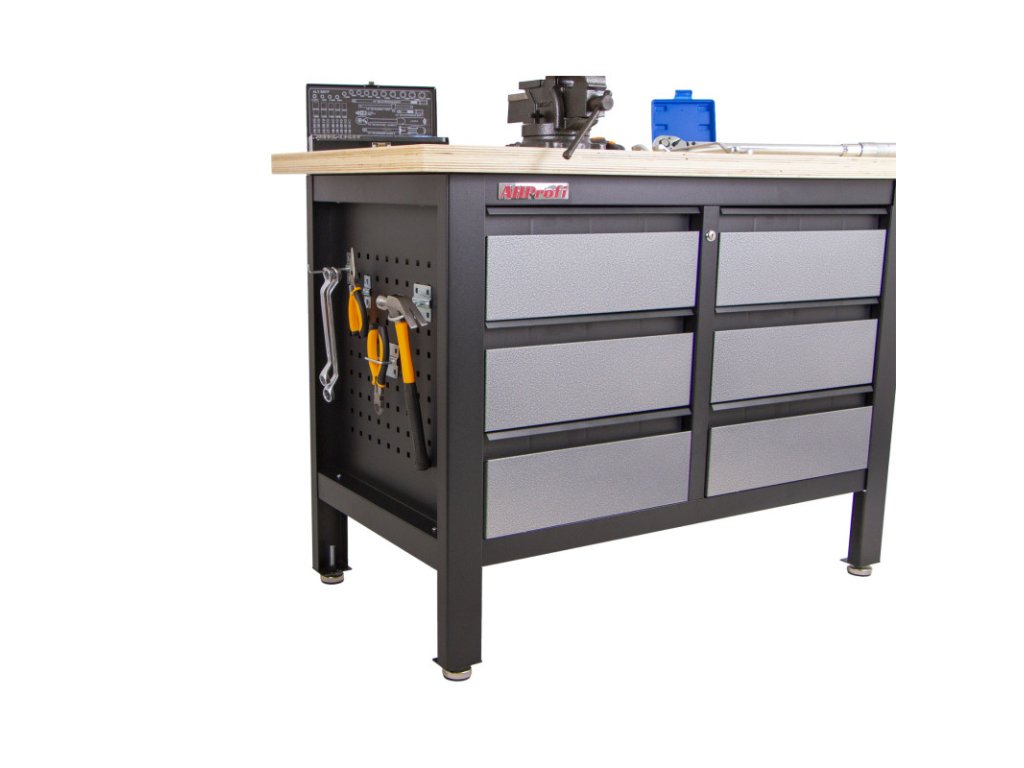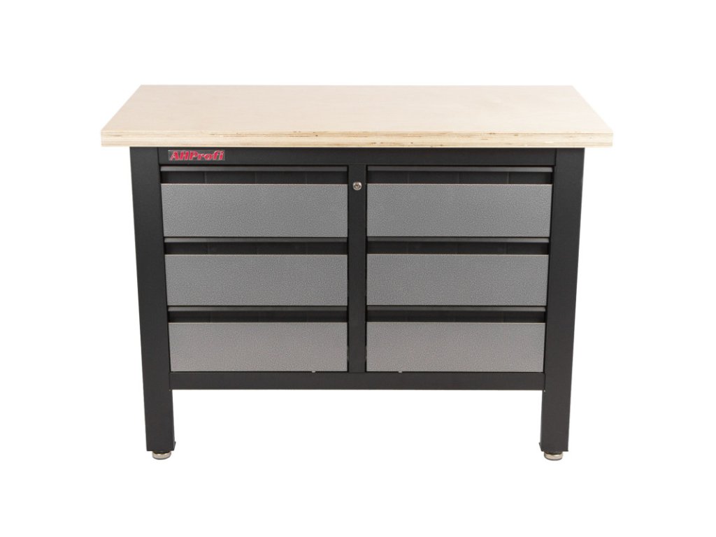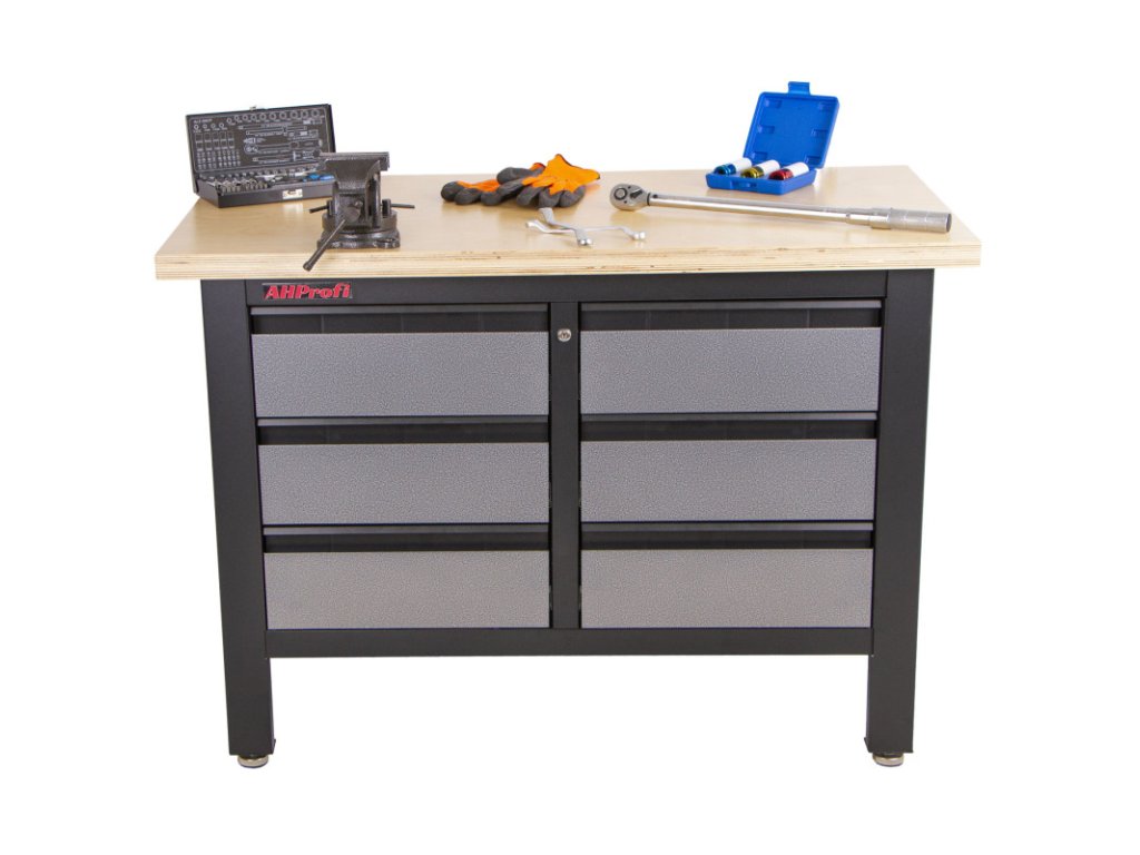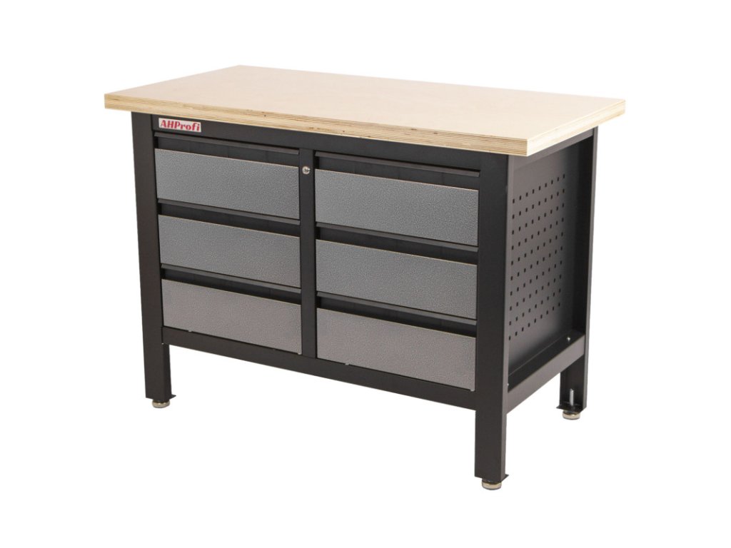 Stůl je vybavený dřevěnou pracovní deskou o rozměrech 1200 x 600 mm a obsahuje 6 uzamykatelných zásuvek.