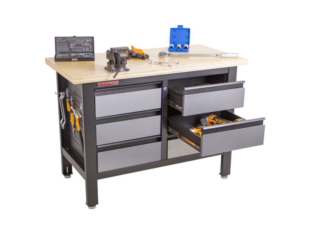 Na pracovní dřevěnou desku o rozměrech 1200 x 600 mm se vejde spousta používaného nářadí, jako je například gola sada nebo momentový klíč.