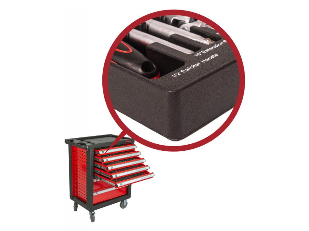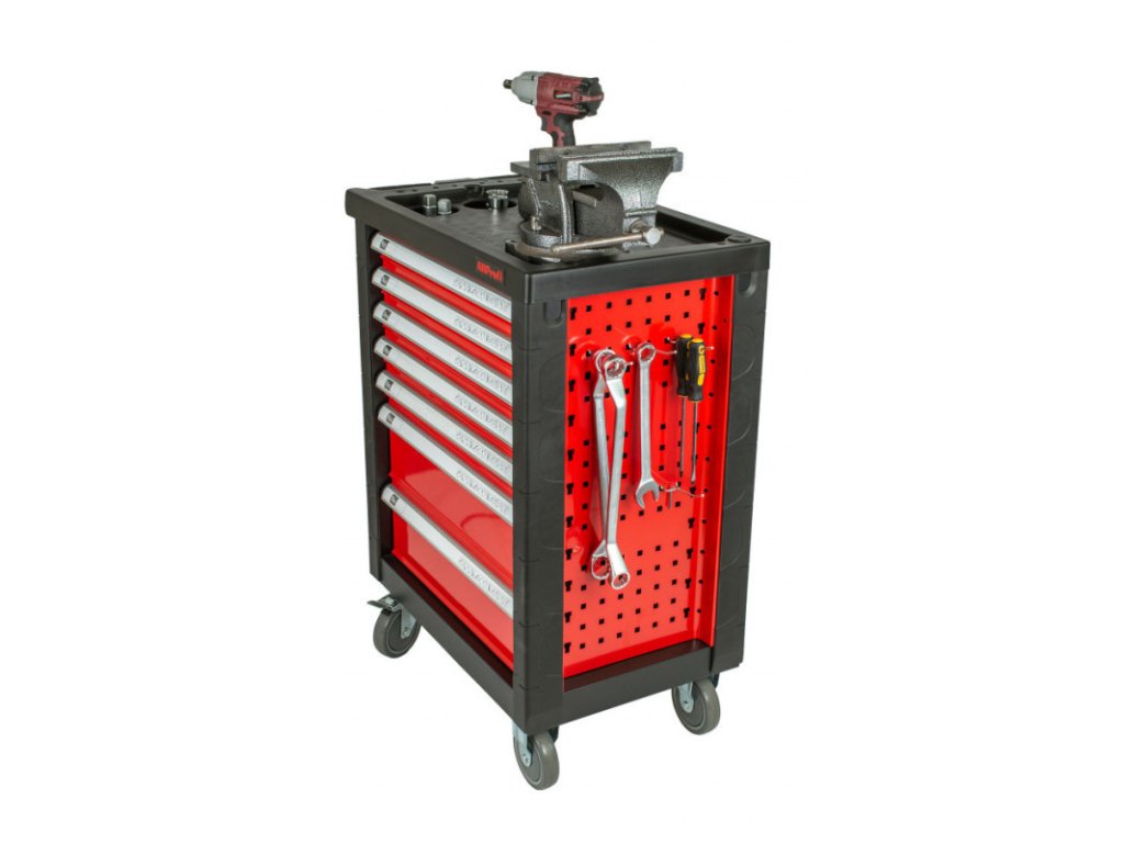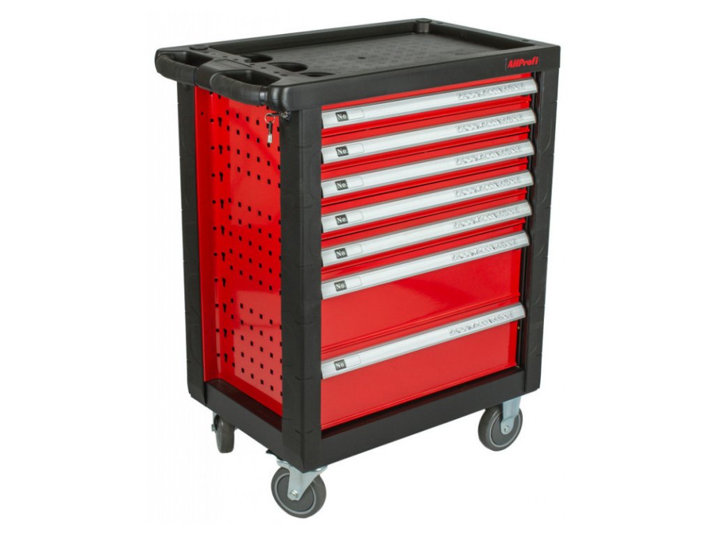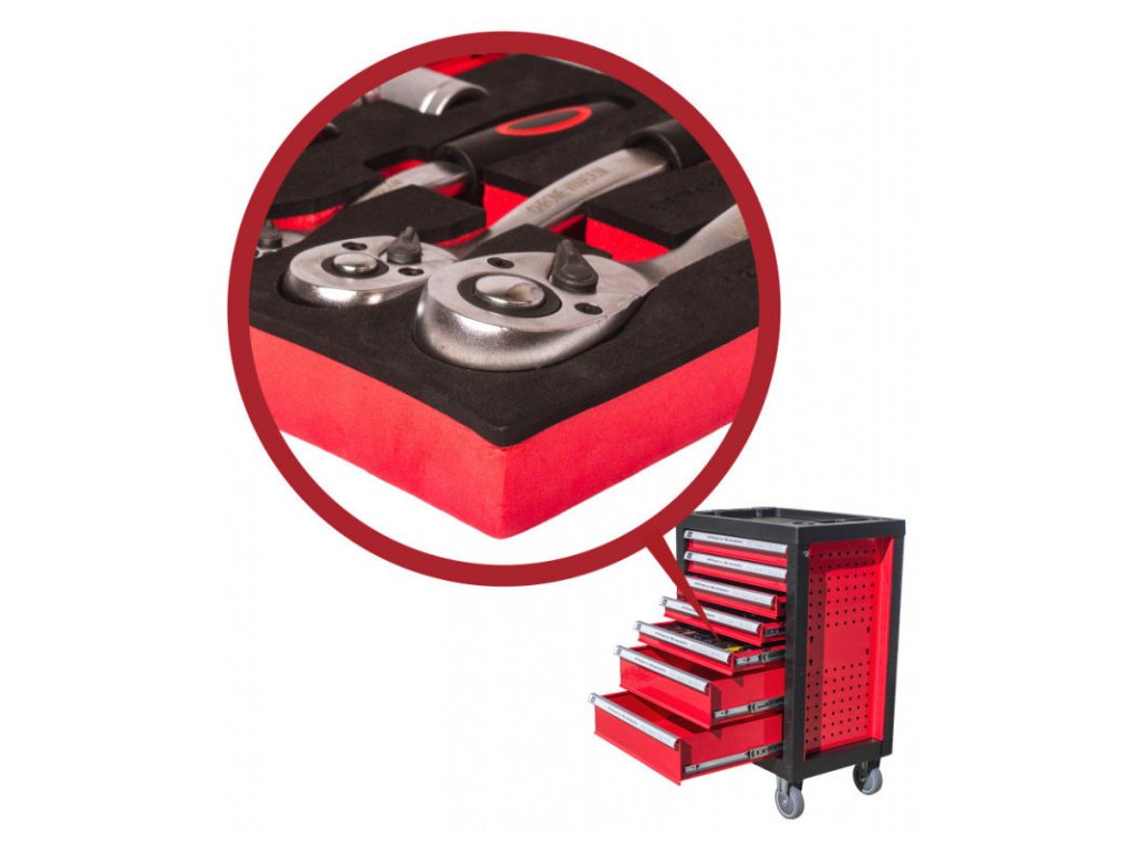 Červený dílenský vozík se 7-mi zásuvkami a rozměrech (š x h x v): 685 x 455 x 975 mm. Vozík je zamykatelný a má 2 pevná a 2 otočná pogumovaná kolečka.