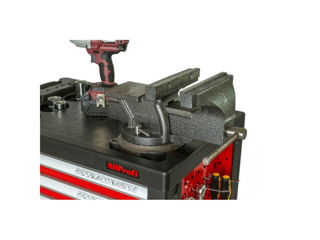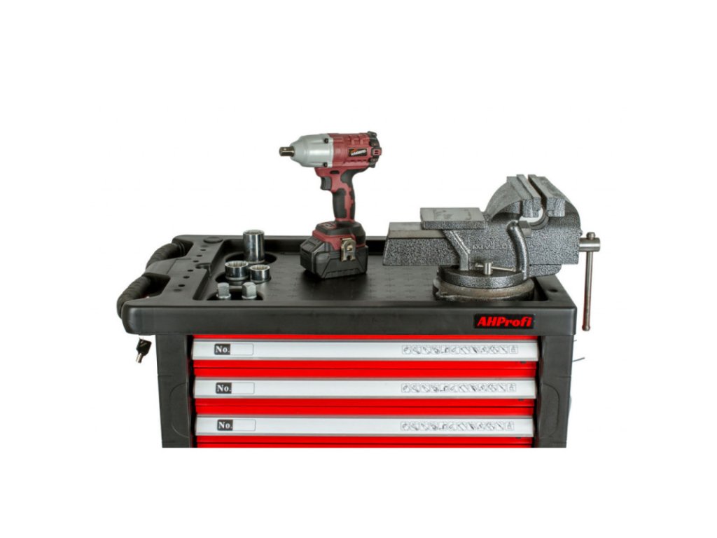 Obsahuje jímky na drobný materiál, místo pro svěrák a dírky na bity.
