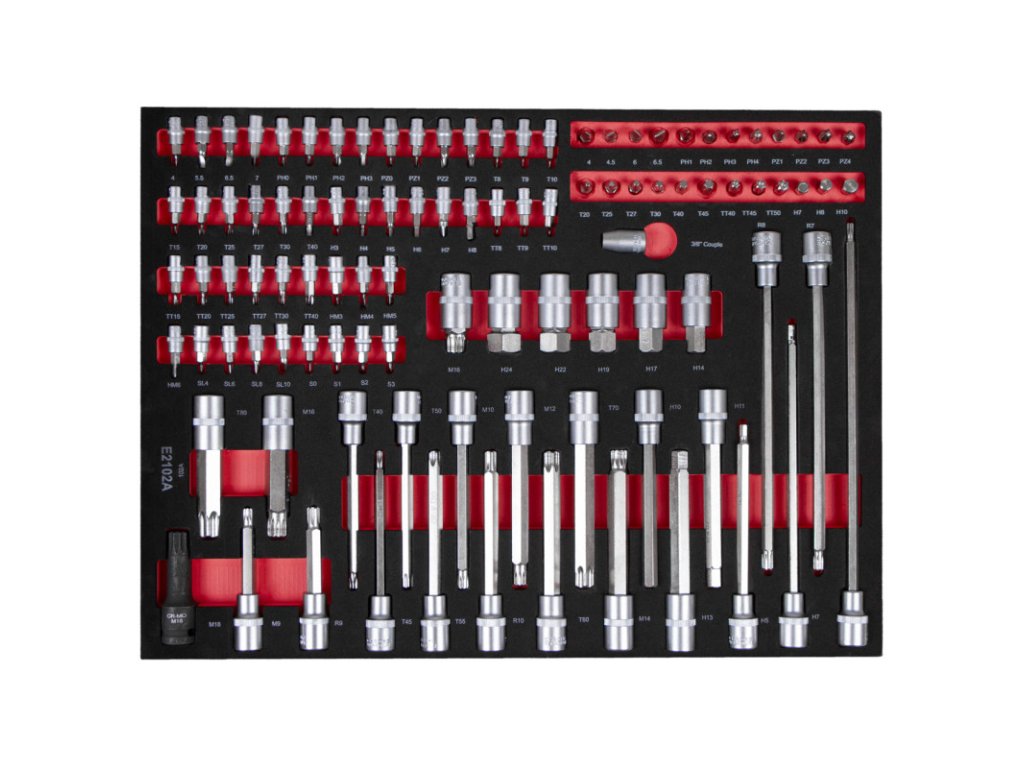 | 48 ks | Hlavice s bity (37 mm): Křížové: PH0, PH1, PH2, PH3, PZ0, PZ1, PZ2, PZ3 Ploché: 4, 5.5, 6.5, 7 mm Torx: T8, T9, T10, T15, T20, T25, T27, T30, T40, TT8, TT9, TT10, TT15, TT20, TT25, TT27, TT30, TT40, TS10, TS15, TS20, TS25, TS27, TS30, TS40, TS45, TS50 Imbus: H3, H4, H5, H6, H7, H8 Tisícihran: M8, M10, M12 |
