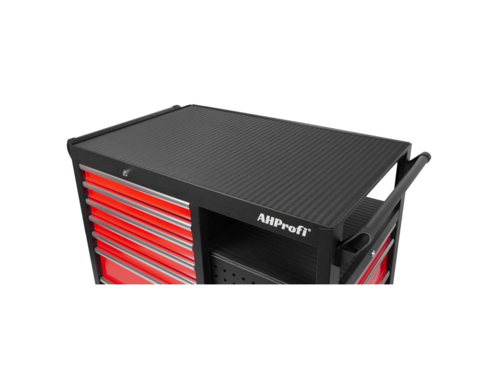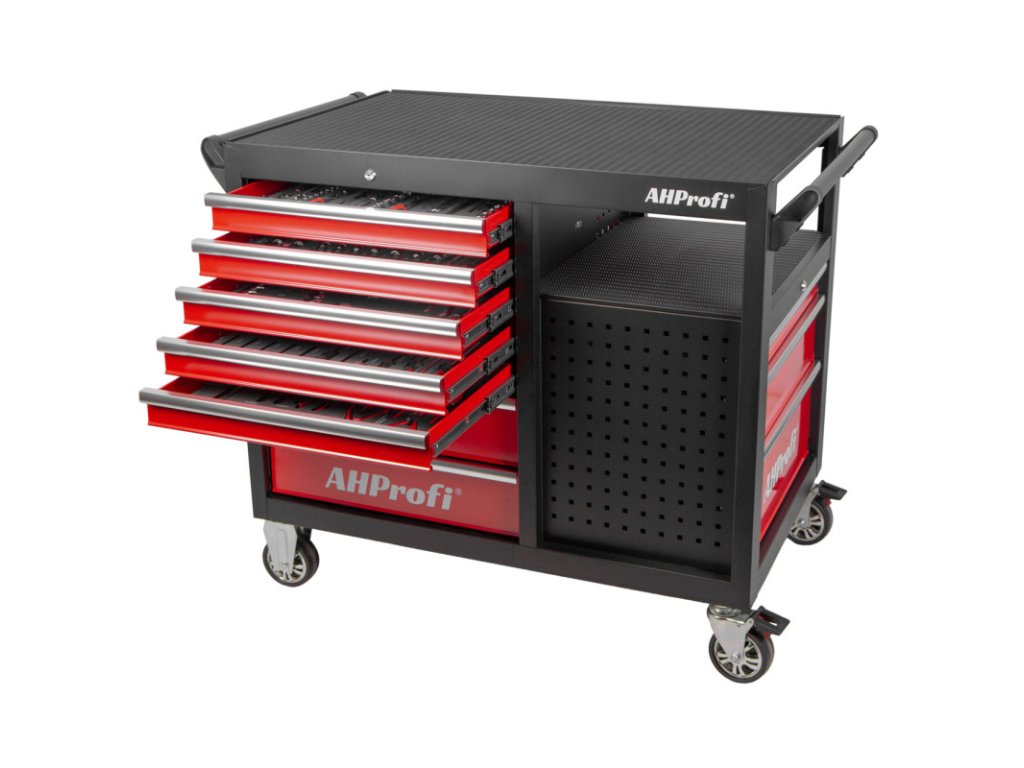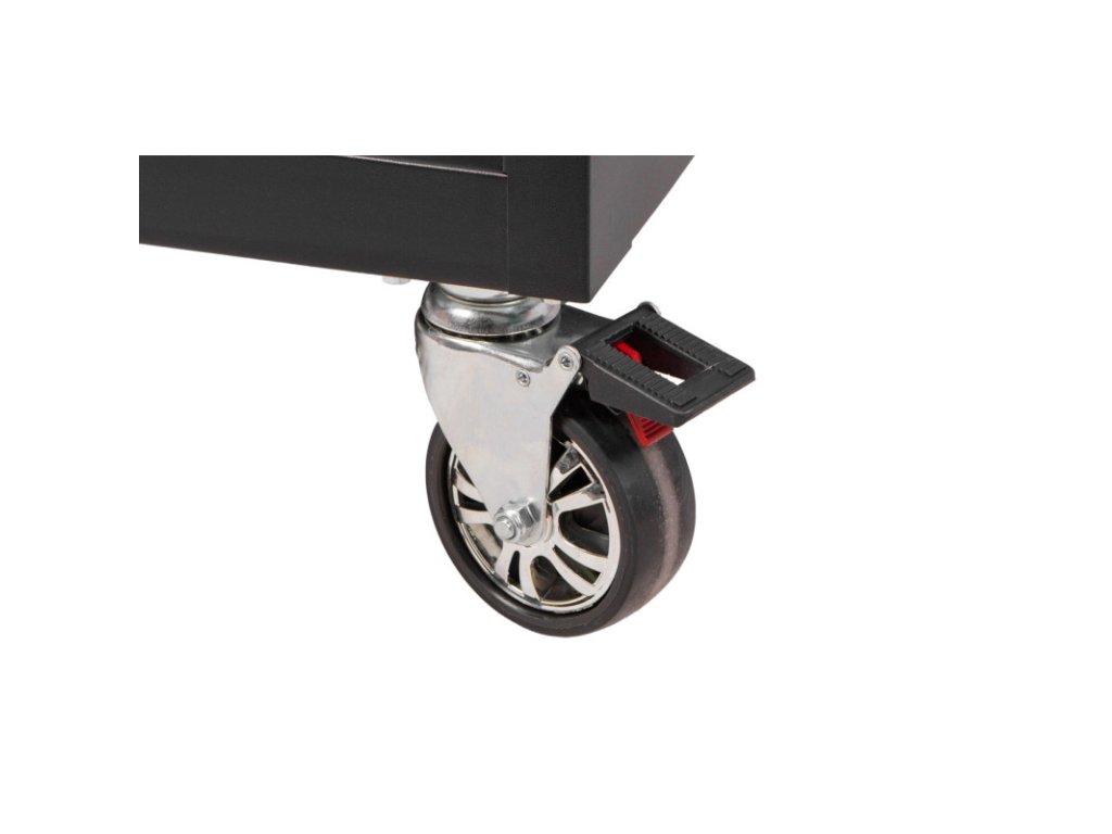 Široká konstrukce vozíku s množstvím úložného prostoru s celkem 10 šuplíky a policemi na nářadí. S celkovými rozměry (š x h x v) 1123 mm x 730 mm x 844 mm (bez koleček), nabízí vozík dostatek úložného prostoru i pro náročné uživatele.