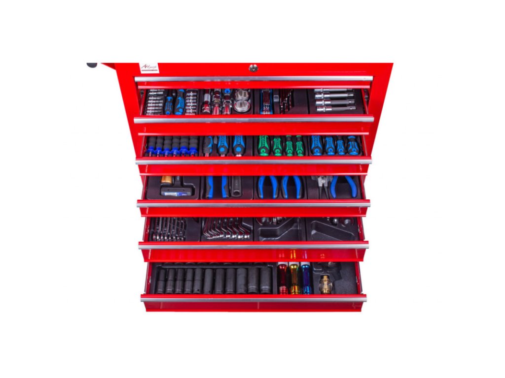 5 zásuvek je vybaveno výplněmi s nářadím. Horní a spodní zásuvka je prázdná.