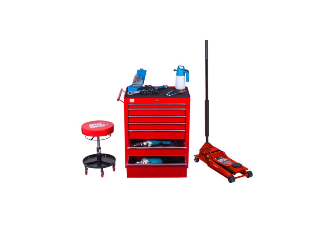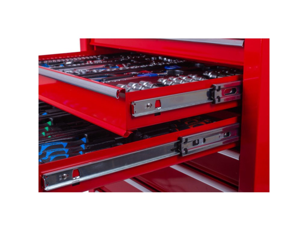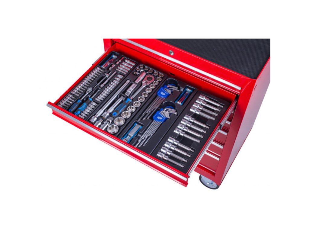 Červený dílenský vozík se 7-mi zásuvkami obsahuje 255 kusů nejpotřebnějšího nářadí od PROFI značky LICOTA. Rozměry vozíku s kolečky jsou: 755 x 460 x 955 (š x h x v). Nářadí se nachází v 17-ti plastových výplní. V sadách nářadí naleznete golu 1/4", 3/8" i 1/2", nástrčné klíče, kleště, kladivo a paličku, šroubováky, IMBUSy, očkoploché klíče, momentový klíč, pneumatický utahovák, atd.