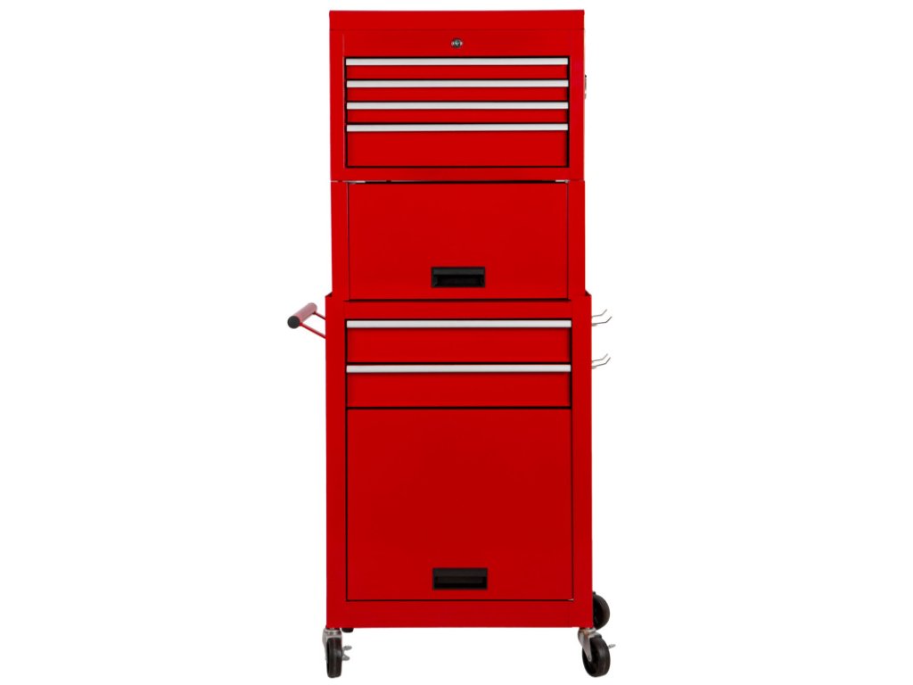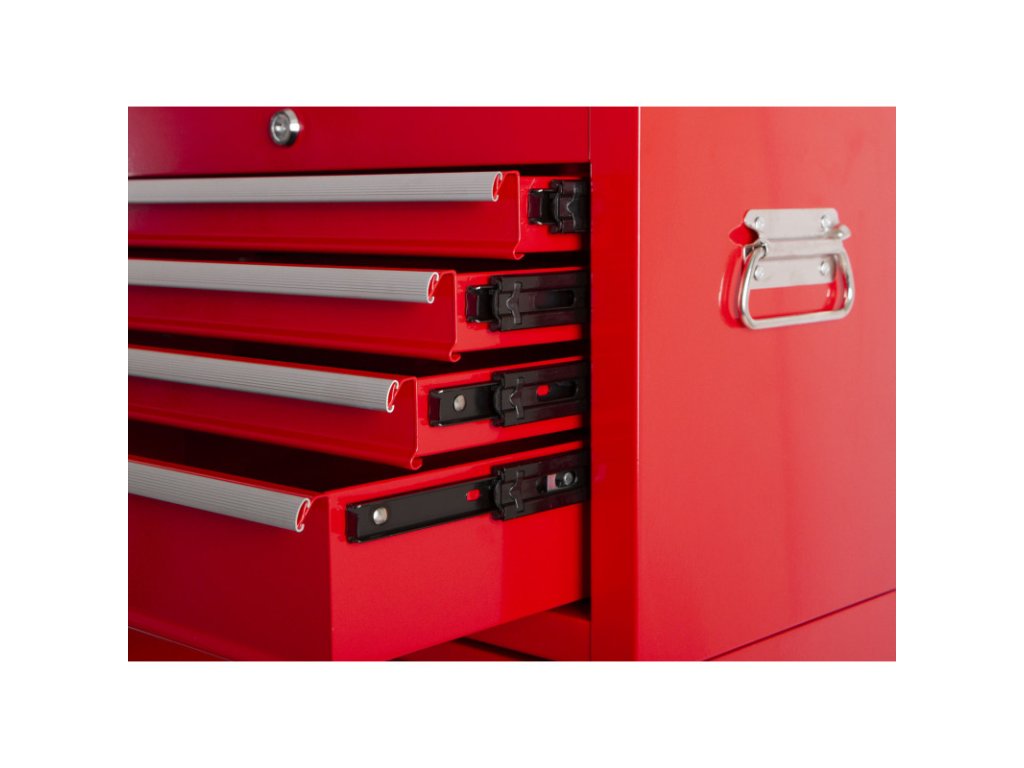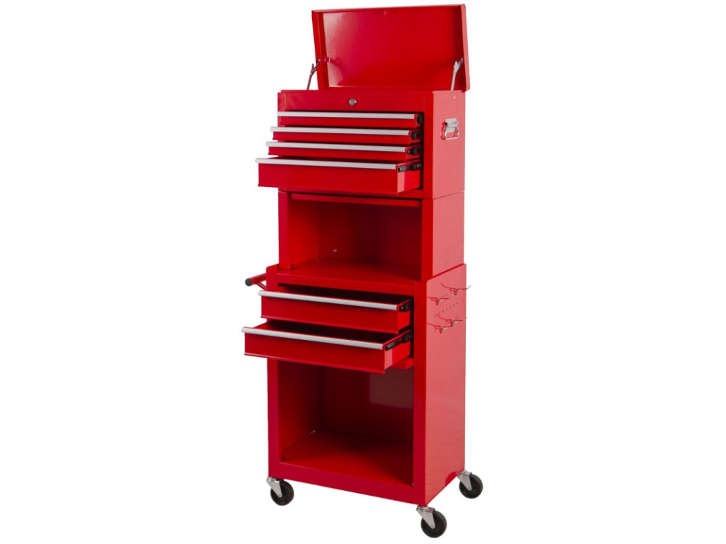 Pojízdný kovový dílenský vozík se 6 šuplíky, horním úložným prostorem a dvojicí skříněk se bude hodit nejednomu profíkovi nebo kutilovi do jeho dílny.