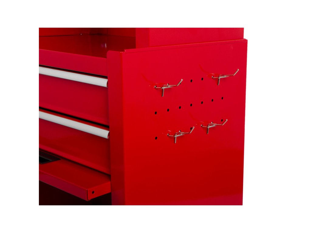 Na boční straně se nachází malá děrovaná deska s háčky pro zavěšení dalšího nářadí.