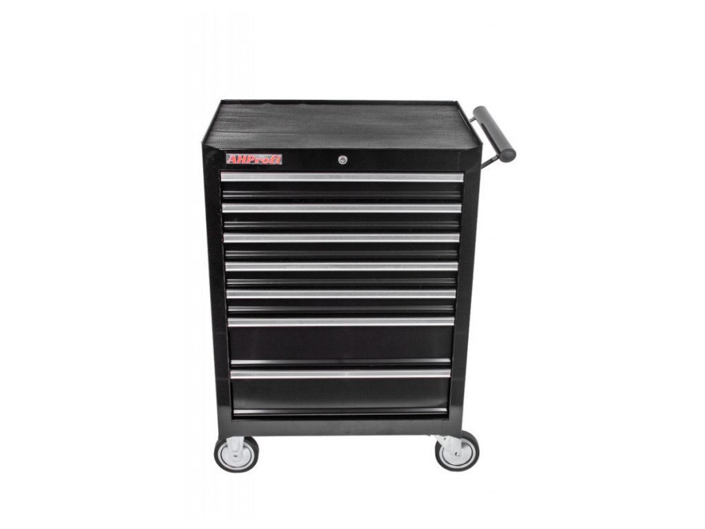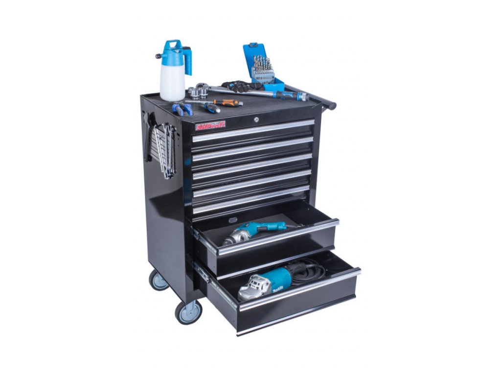 Dílenský vozík je celokovový se sedmi zásuvkami a pracovní plochou.