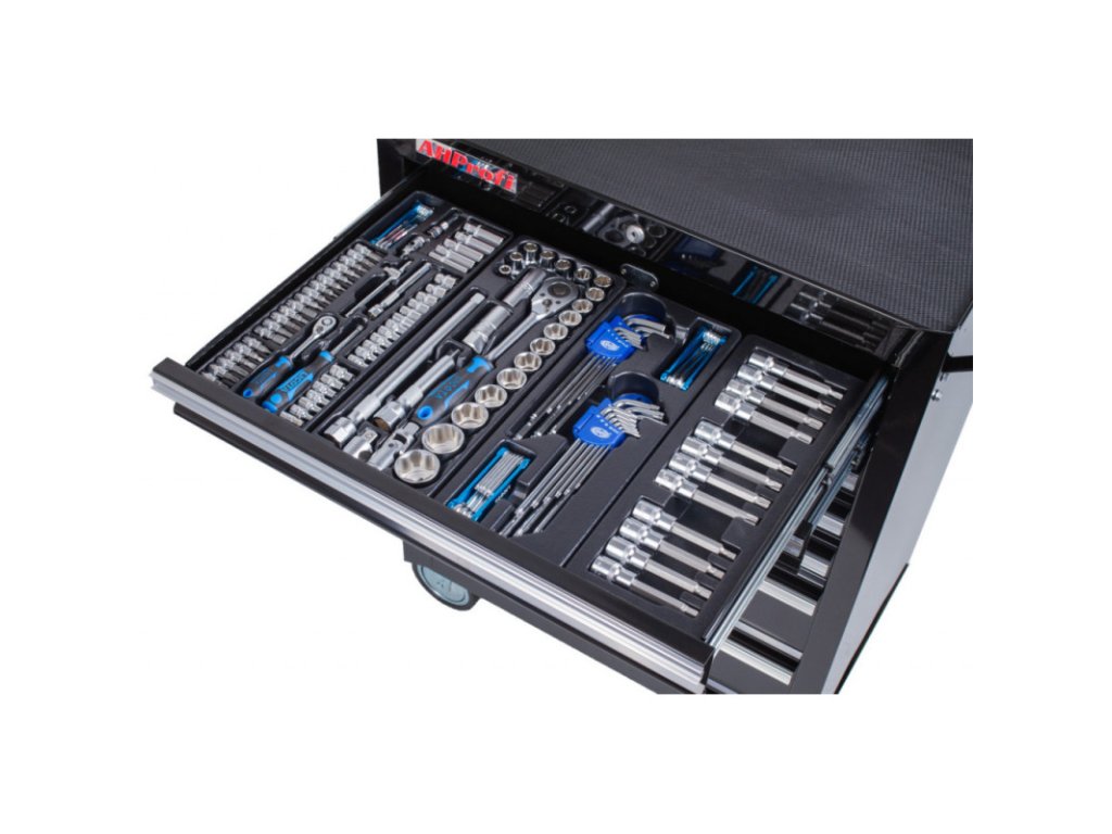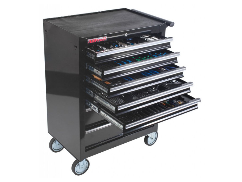 Černý dílenský vozík se 7-mi zásuvkami obsahuje 255 kusů nejpotřebnějšího nářadí od PROFI značky LICOTA. Rozměry vozíku s kolečky jsou: 770 x 460 x 1000 (š x h x v). Nářadí se nachází v 17-ti plastových výplní. V sadách nářadí naleznete golu 1/4", 3/8" i 1/2", nástrčné klíče, kleště, kladivo a paličku, šroubováky, IMBUSy, očkoploché klíče, momentový klíč, pneumatický utahovák, atd.