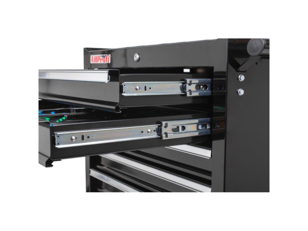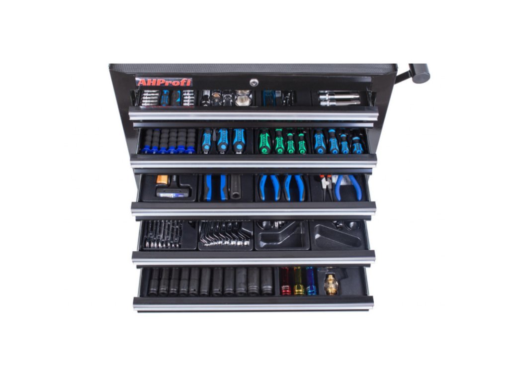 Horních 5 zásuvek je vybaveno výplněmi s nářadím. Spodní 2 vyšší zásuvky jsou prázdné.