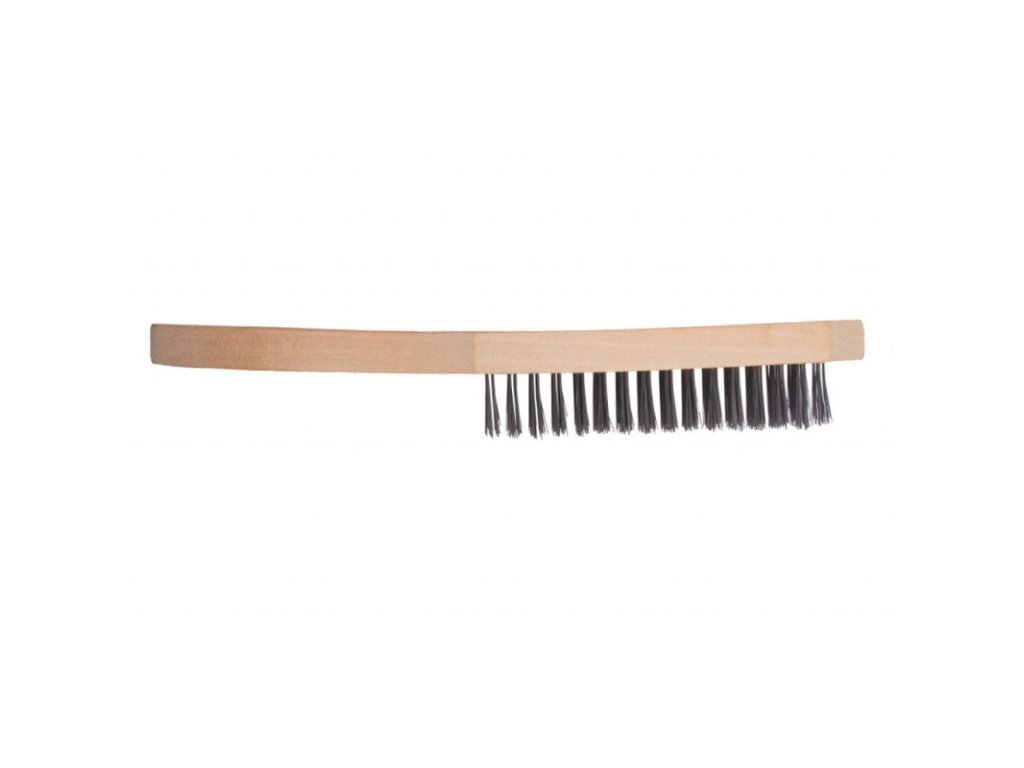 Dřevěný drátěný kartáč je vhodný na odstranění hrubých nečistot z kovů a jiných odolných materiálů. Ruční kartáč je osazen řadou ocelových štětin.