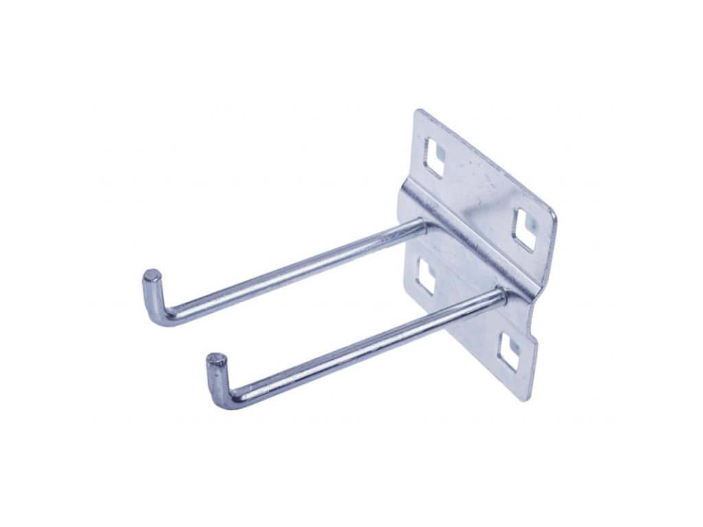 Dvojitý hák dlouhý 87 mm je určen pro děrované desky s roztečí 38 x 38 mm. Připevněním na perforovaný panel lze rozšířit úložný prostor také pro sestavy dílenského nábytku, dílenské vozíky s nářadím i bez nářadí, pracovní stoly i policové regály.