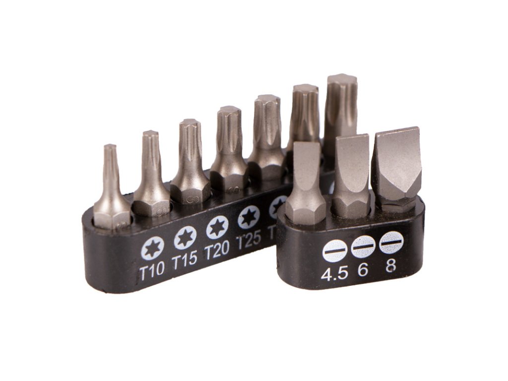 - 17 x 1/4" bitové nástavce L=25mm: PH1, PH2, PH3, SL4.5, SL6, SL8, H3, H4, H5, H6, T10, T15, T20, T25, T27, T30, T40