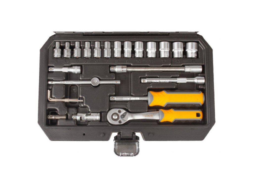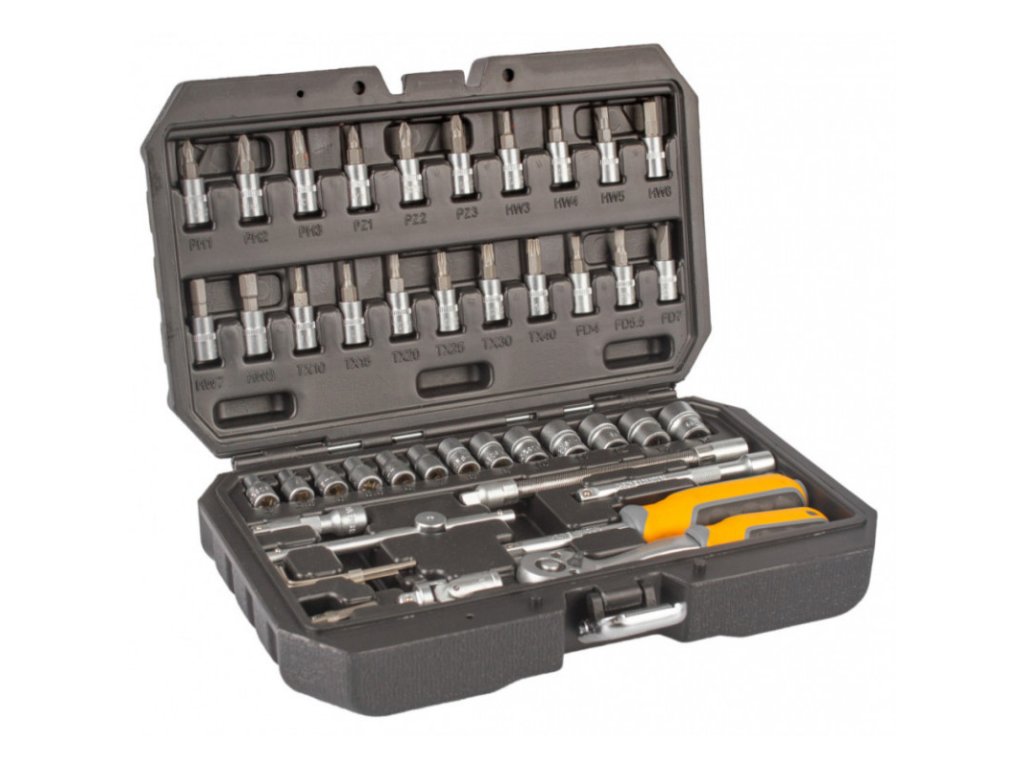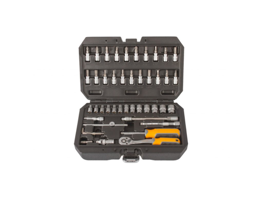 Gola sada s ráčnou 1/4" v praktickém plastovém kufříku, díky kterému sadu snadno přenesete. Díky ergonomickému tvaru rukojeti padne ráčna se šroubovákem dobře do ruky a docílíte tak pevnějšího úchopu. Rukojeť je navíc vyrobena z protiskluzových materiálů (kombinace plastu a gumy).