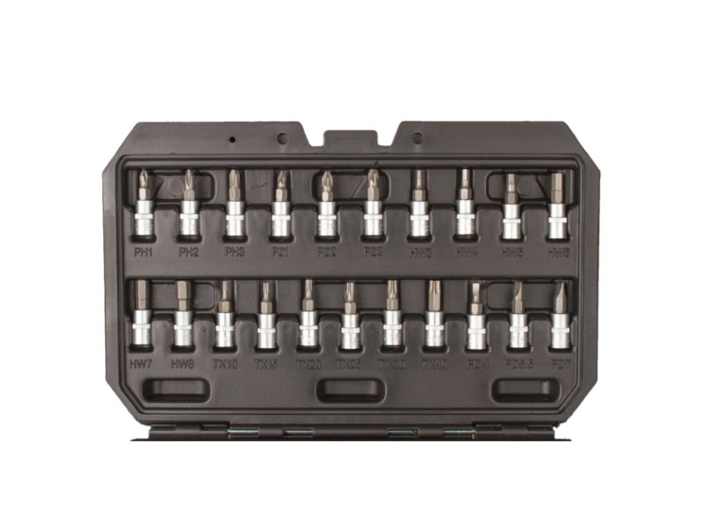 V sadě naleznete nástrčné klíče pro ráčnu 1/4" o velikostech 4 až 14 mm, dále TORX, HEX, ploché, křížové bity a další příslušenství.