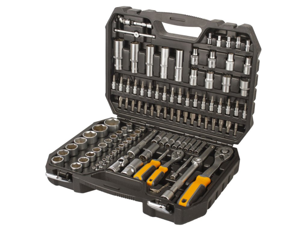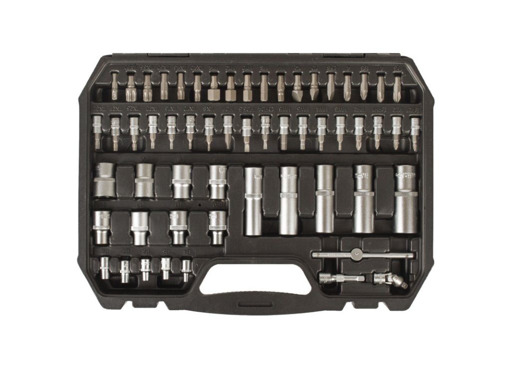 V sadě naleznete nástrčné klíče pro ráčny 1/4" a 1/2" o velikostech 4 až 32 mm, dále TORX, HEX, ploché, křížové bity a další příslušenství.