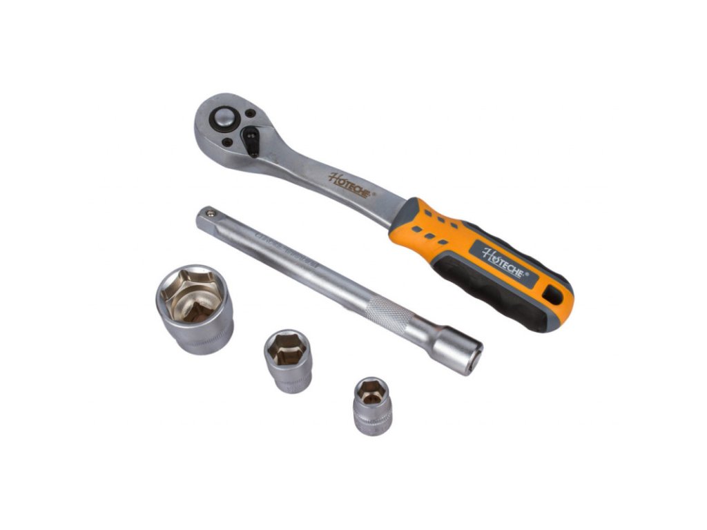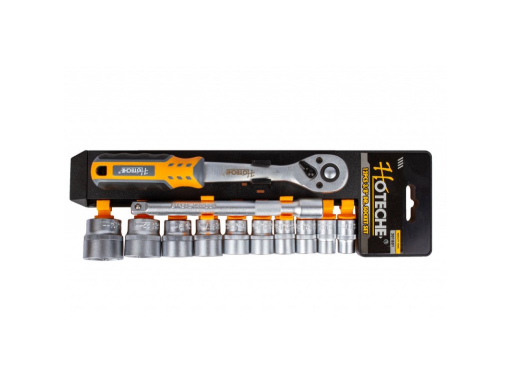 Gola sada s ráčnou 3/8" o délce 205 mm v praktickém plastovém držáku, díky kterému sadu snadno přenesete nebo zavěsíte v garáži, dílně, apod.