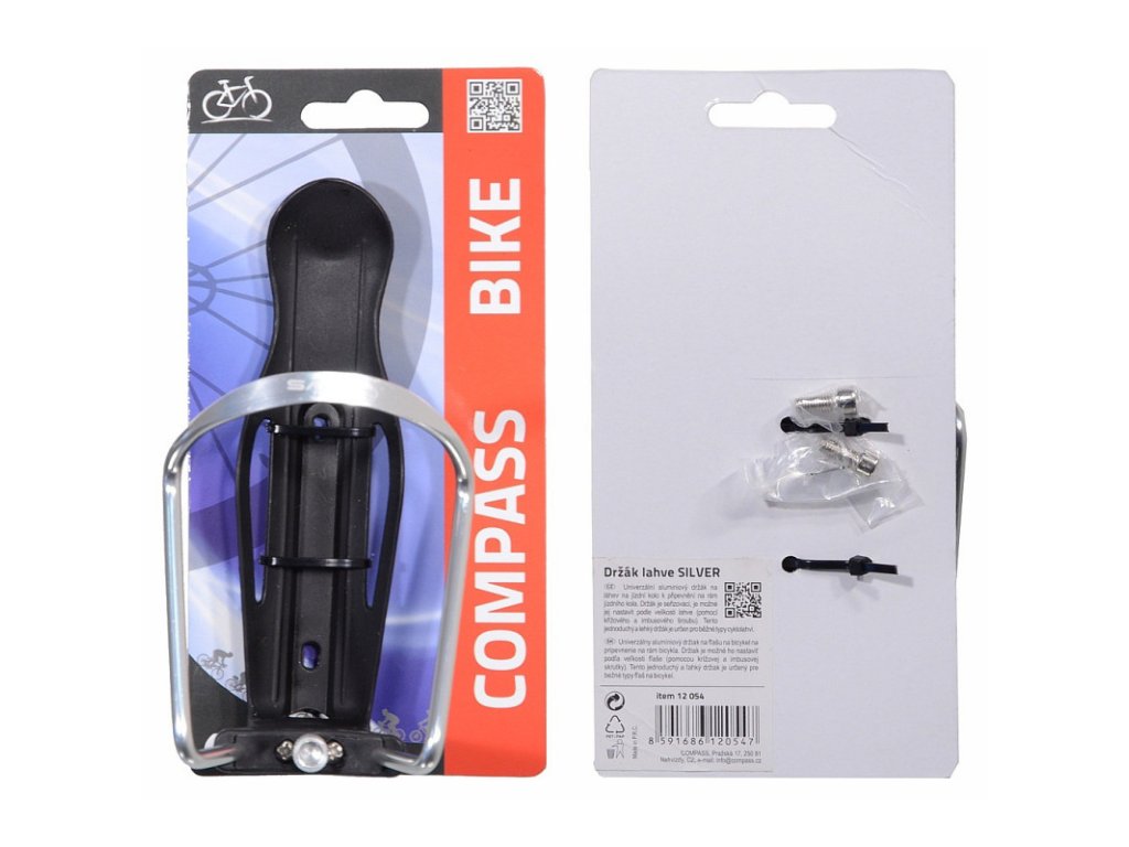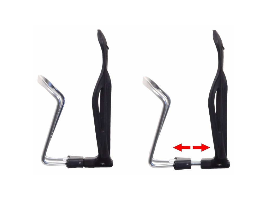 Univerzální stavitelný držák na láhev na jízdní kolo k připevnění na rám jízdního kola. Základna je vyrobena z pevného plastu, uchycení lahve z hliníku.