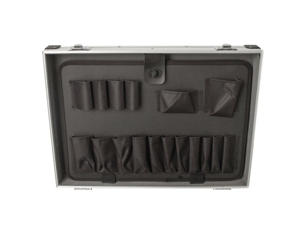 Hliníkový kufr na nářadí o rozměrech (š x h x v): 460 x 330 x 150 mm. Kufr je lehce přenosný díky madlu, nebo přídavnému popruhu na ramena.