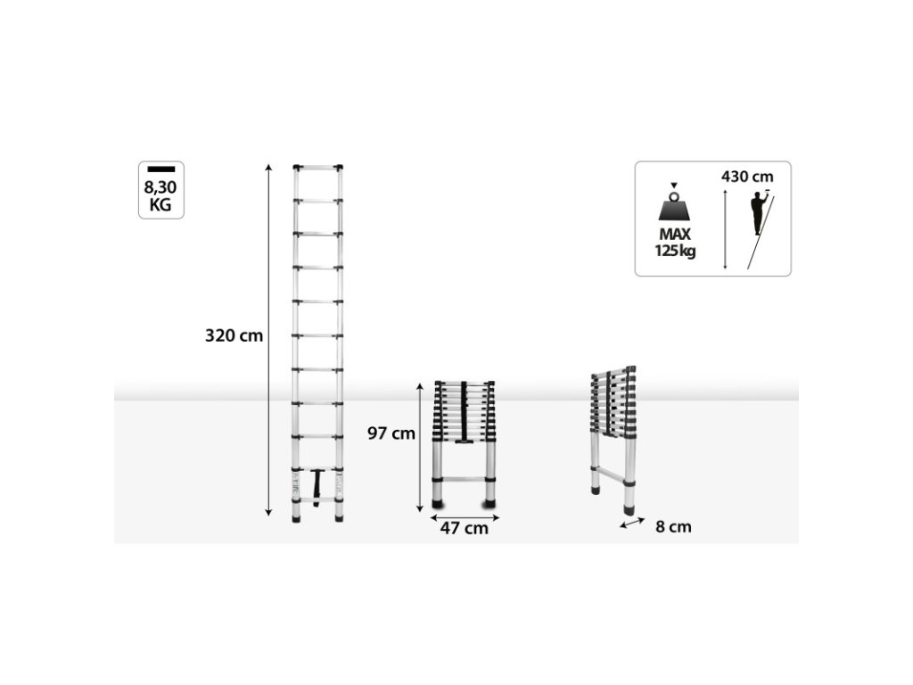 Hliníkový teleskopický žebřík, 11 stupňů, 3,2 m, max. zátěž 125 kg