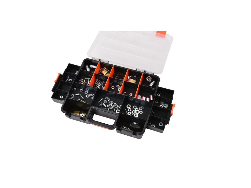 Hluboký plastový organizér s bočními šuplíky na drobný materiál jako jsou například šroubky či matice.