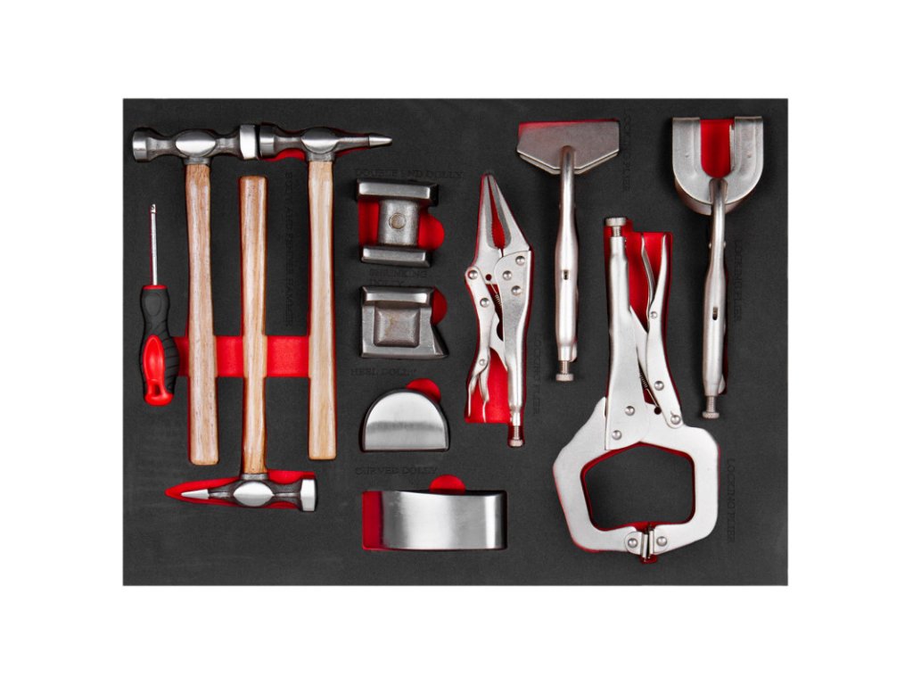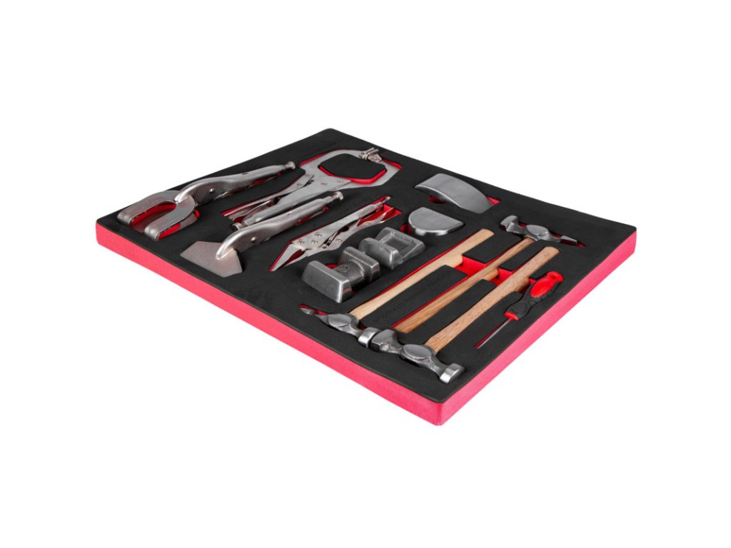 Sada klempířských kladiv, babek a svěrek, vhodná pro opravy karoserií a klempířské práce, uložená v přehledné pěnové výplni.