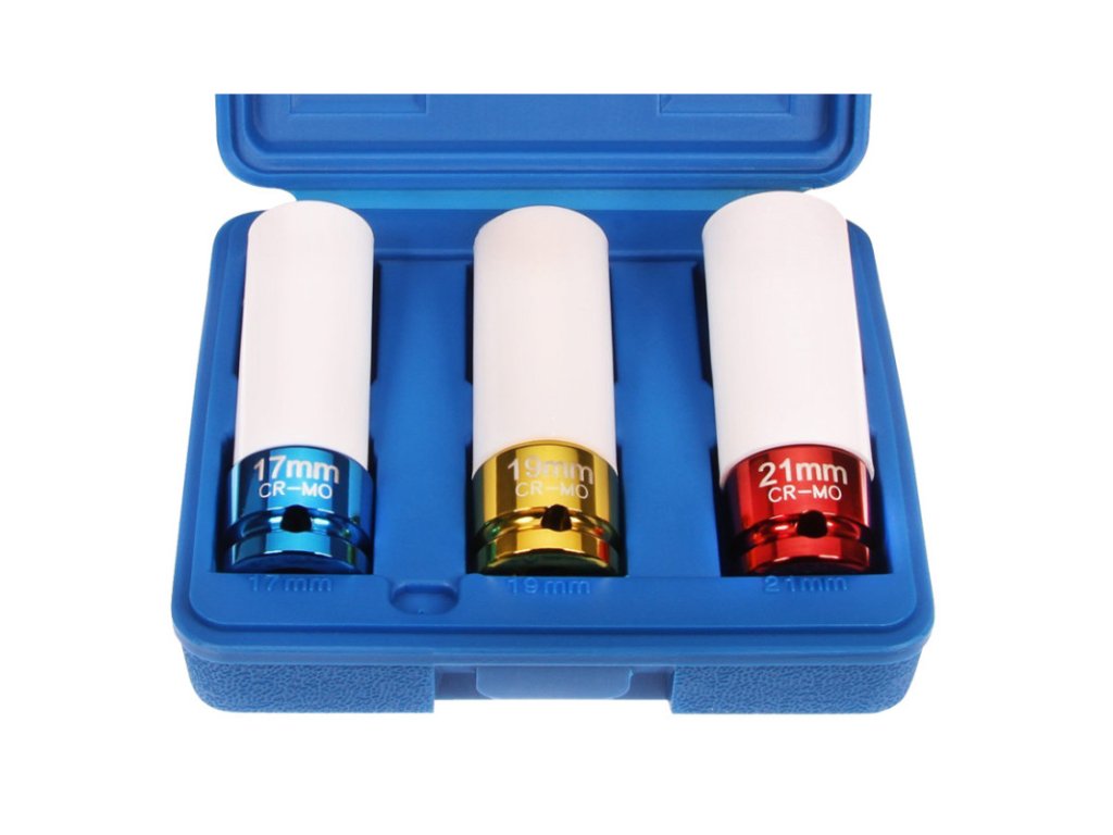 Sada obsahuje 3 ks klíčů o velikostech 17 mm (modrá), 19 mm (zlatá), 21 mm (červená).
