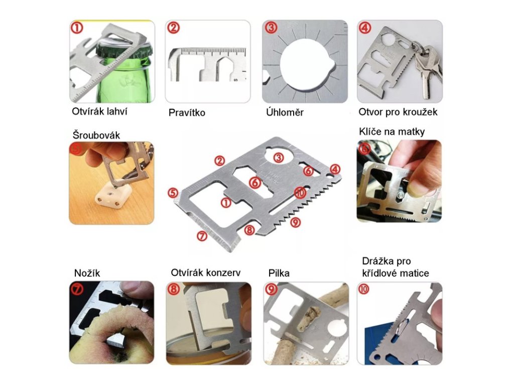 Kovová multifunkční karta 11 v 1 pro přežití s pouzdrem