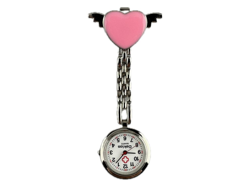 Kovové připínací kapesní hodinky srdce s křídly nejen pro zdravotní sestru - Růžové