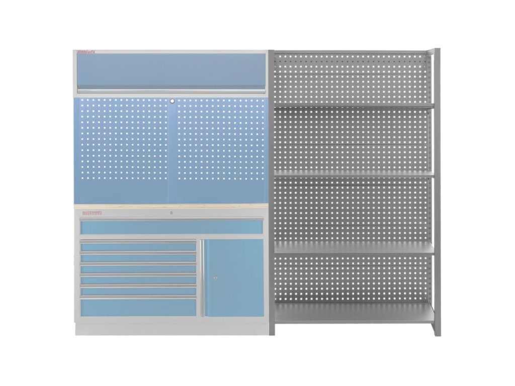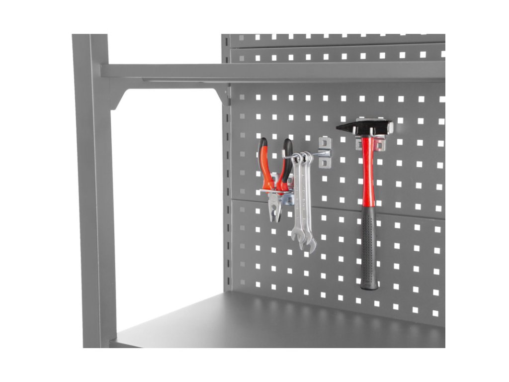 Stabilitu regálu zajišťují dvě bočnice a zadní děrovaná deska, která lze také využít pro zavěšení drobného nářadí pomocí háčků (háčky nejsou součástí balení).