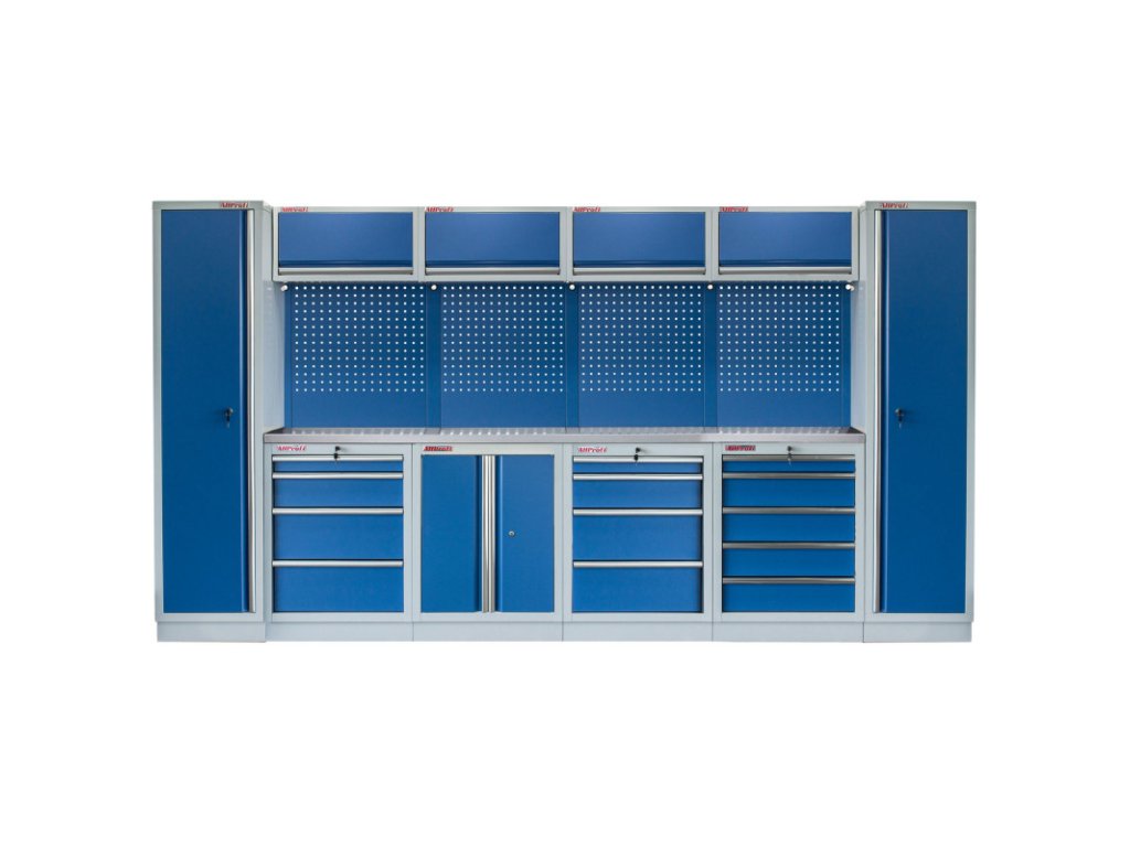 Dílenský nábytek PROFI BLUE s nerezovou deskou zaujme moderním a profesionálním vzhledem. Kombinace modré RAL 5023 a šedé RAL 7035 barvy se bude vyjímat v každé garáži i dílně. Sestava nábytku v sobě skrývá dostatečné množství úložného prostoru pro vaše nářadí, autotechniku i dílenské vybavení. V kombinaci s bytelnou pracovní deskou získáte multifunkční stěnu, se kterou vám půjde práce od ruky ve všech směrech. Jednotlivé komponenty jsou plně konfigurovatelné, sestavu je možné dle vašich potřeb rozšířit o další skříně, regály i ponk.Sestava nábytku MTGS1300A88