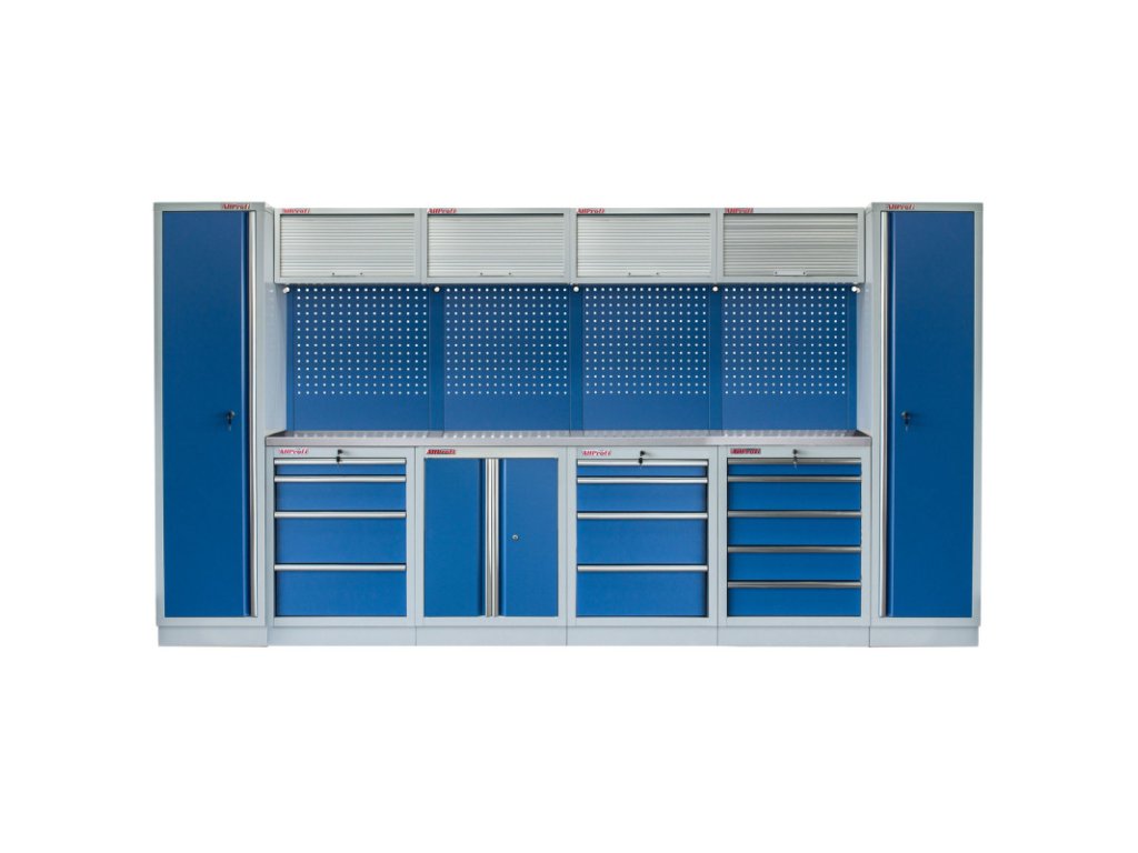 Dílenský nábytek PROFI BLUE s nerezovou deskou zaujme moderním a profesionálním vzhledem. Kombinace modré RAL 5023 a šedé RAL 7035 barvy se bude vyjímat v každé garáži i dílně. Sestava nábytku v sobě skrývá dostatečné množství úložného prostoru pro vaše nářadí, autotechniku i dílenské vybavení. V kombinaci s bytelnou pracovní deskou získáte multifunkční stěnu, se kterou vám půjde práce od ruky ve všech směrech. Jednotlivé komponenty jsou plně konfigurovatelné, sestavu je možné dle vašich potřeb rozšířit o další skříně, regály i ponk.Sestava nábytku MTGS1300A99