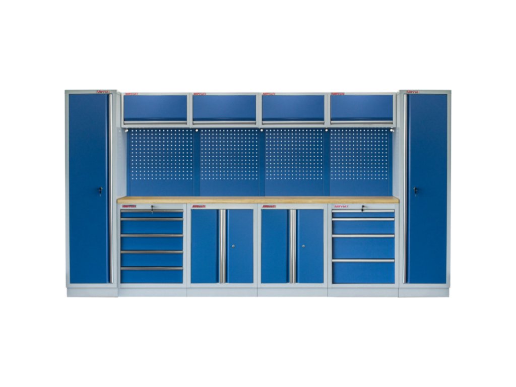 Dílenský nábytek PROFI BLUE s dřevěnou deskou zaujme moderním a profesionálním vzhledem. Kombinace modré RAL 5023 a šedé RAL 7035 barvy se bude vyjímat v každé garáži i dílně. Sestava nábytku v sobě skrývá dostatečné množství úložného prostoru pro vaše nářadí, autotechniku i dílenské vybavení. V kombinaci s bytelnou pracovní deskou získáte multifunkční stěnu, se kterou vám půjde práce od ruky ve všech směrech. Jednotlivé komponenty jsou plně konfigurovatelné, sestavu je možné dle vašich potřeb rozšířit o další skříně, regály i ponk.Sestava nábytku MTGS1300AA4