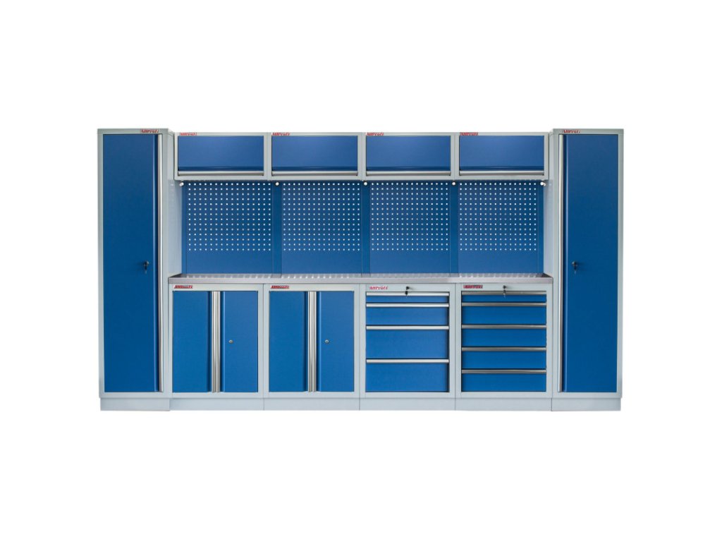 Dílenský nábytek PROFI BLUE s nerezovou deskou zaujme moderním a profesionálním vzhledem. Kombinace modré RAL 5023 a šedé RAL 7035 barvy se bude vyjímat v každé garáži i dílně. Sestava nábytku v sobě skrývá dostatečné množství úložného prostoru pro vaše nářadí, autotechniku i dílenské vybavení. V kombinaci s bytelnou pracovní deskou získáte multifunkční stěnu, se kterou vám půjde práce od ruky ve všech směrech. Jednotlivé komponenty jsou plně konfigurovatelné, sestavu je možné dle vašich potřeb rozšířit o další skříně, regály i ponk.Sestava nábytku MTGS1300BB8