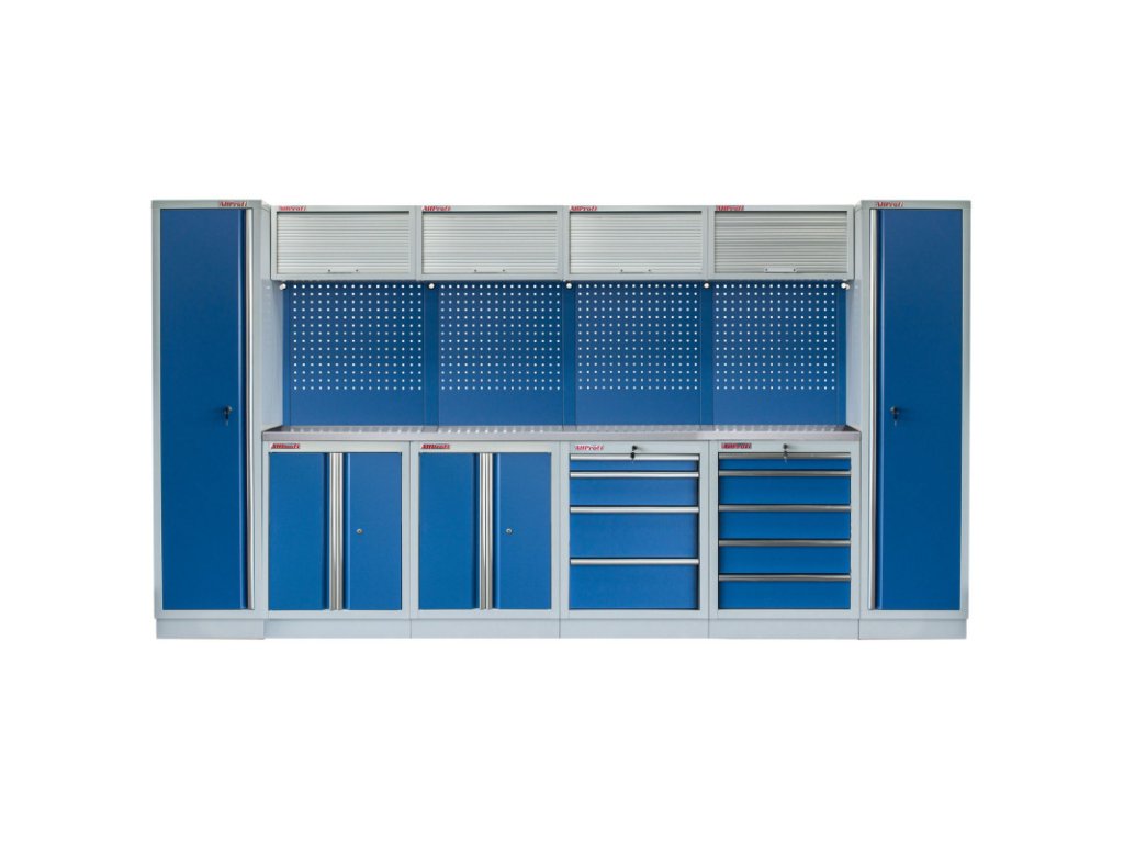 Dílenský nábytek PROFI BLUE s nerezovou deskou zaujme moderním a profesionálním vzhledem. Kombinace modré RAL 5023 a šedé RAL 7035 barvy se bude vyjímat v každé garáži i dílně. Sestava nábytku v sobě skrývá dostatečné množství úložného prostoru pro vaše nářadí, autotechniku i dílenské vybavení. V kombinaci s bytelnou pracovní deskou získáte multifunkční stěnu, se kterou vám půjde práce od ruky ve všech směrech. Jednotlivé komponenty jsou plně konfigurovatelné, sestavu je možné dle vašich potřeb rozšířit o další skříně, regály i ponk.Sestava nábytku MTGS1300BB9
