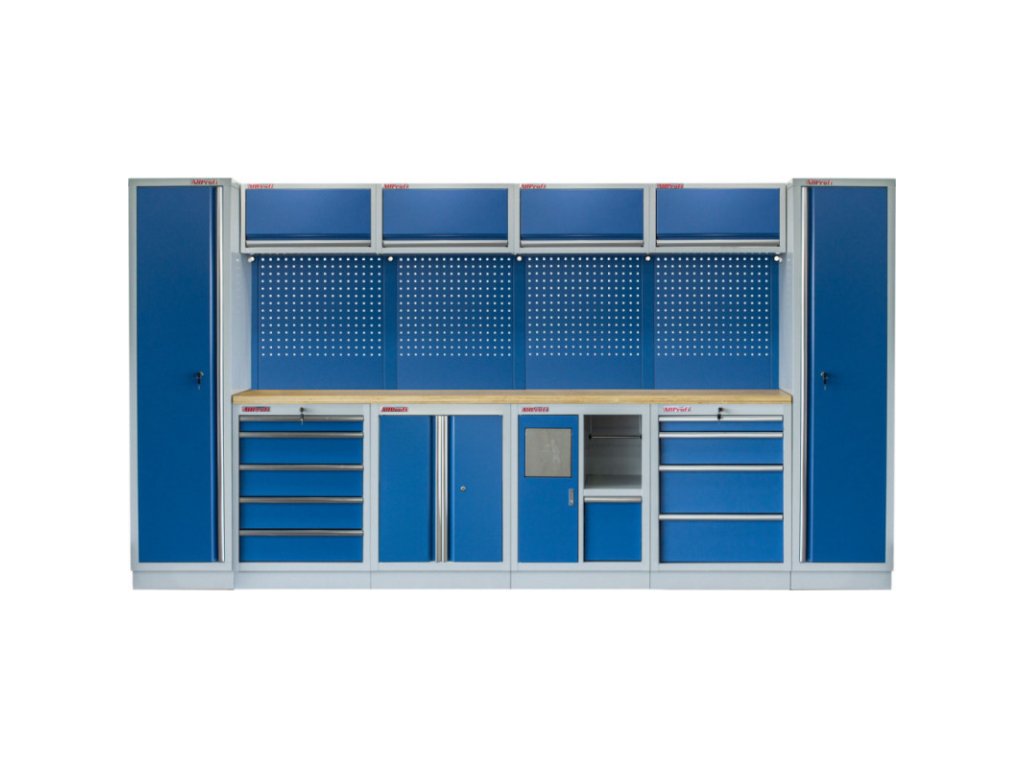 Dílenský nábytek PROFI BLUE s dřevěnou deskou zaujme moderním a profesionálním vzhledem. Kombinace modré RAL 5023 a šedé RAL 7035 barvy se bude vyjímat v každé garáži i dílně. Sestava nábytku v sobě skrývá dostatečné množství úložného prostoru pro vaše nářadí, autotechniku i dílenské vybavení. V kombinaci s bytelnou pracovní deskou získáte multifunkční stěnu, se kterou vám půjde práce od ruky ve všech směrech. Jednotlivé komponenty jsou plně konfigurovatelné, sestavu je možné dle vašich potřeb rozšířit o další skříně, regály i ponk.Sestava nábytku MTGS1301AR